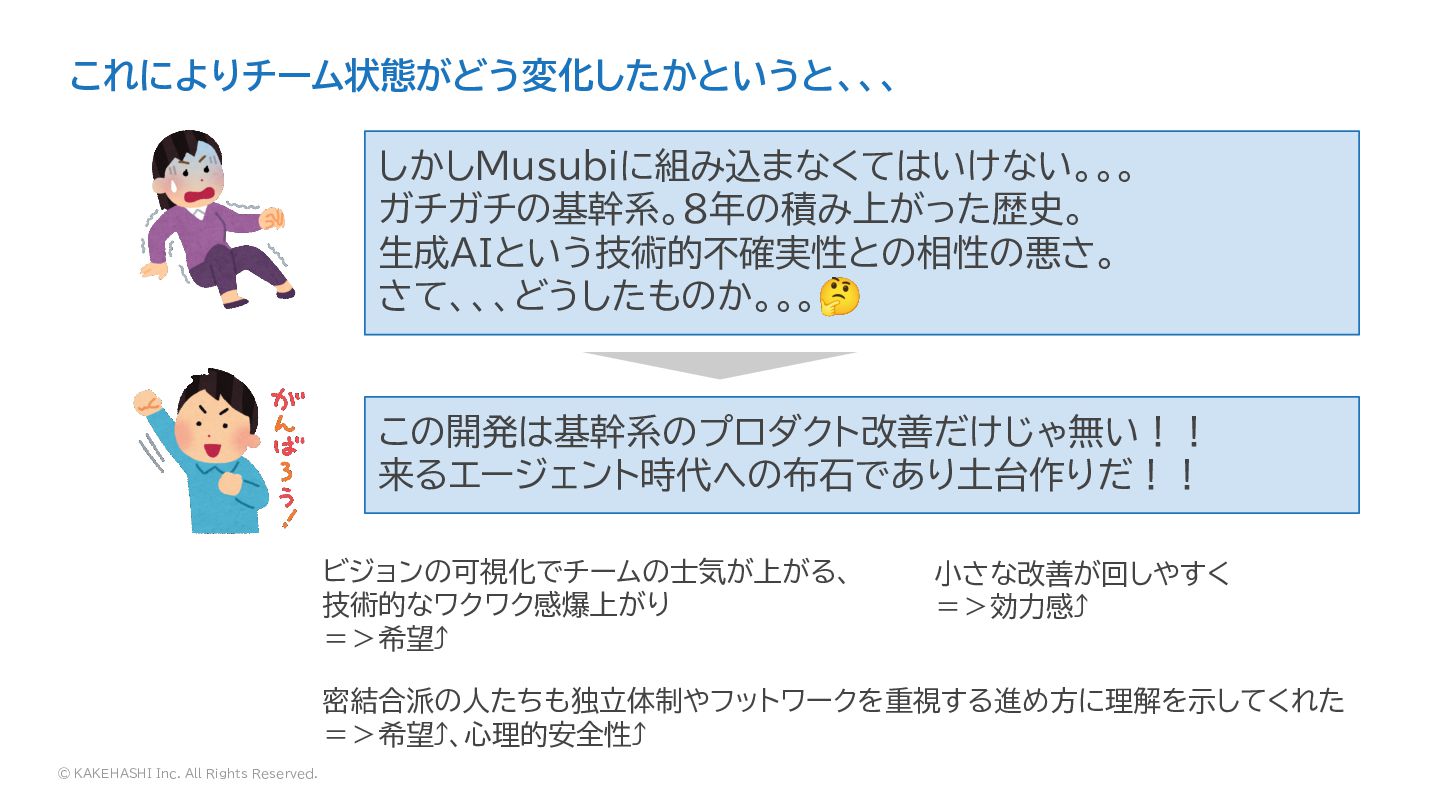 これによりチーム状態がどう変化したかというと、、、 ビジョンの可視化でチームの士気が上がる、 技術的なワクワク感爆上がり =>希望⤴ 密結合派の人たちも独立体制やフットワークを重視する進め方に理解を示してくれた =>希望⤴、心理的安全性⤴ 小さな改善が回しやすく =>効力感⤴ この開発は基幹系のプロダクト改善だけじゃ無い!! 来るエージェント時代への布石であり土台作りだ!!
