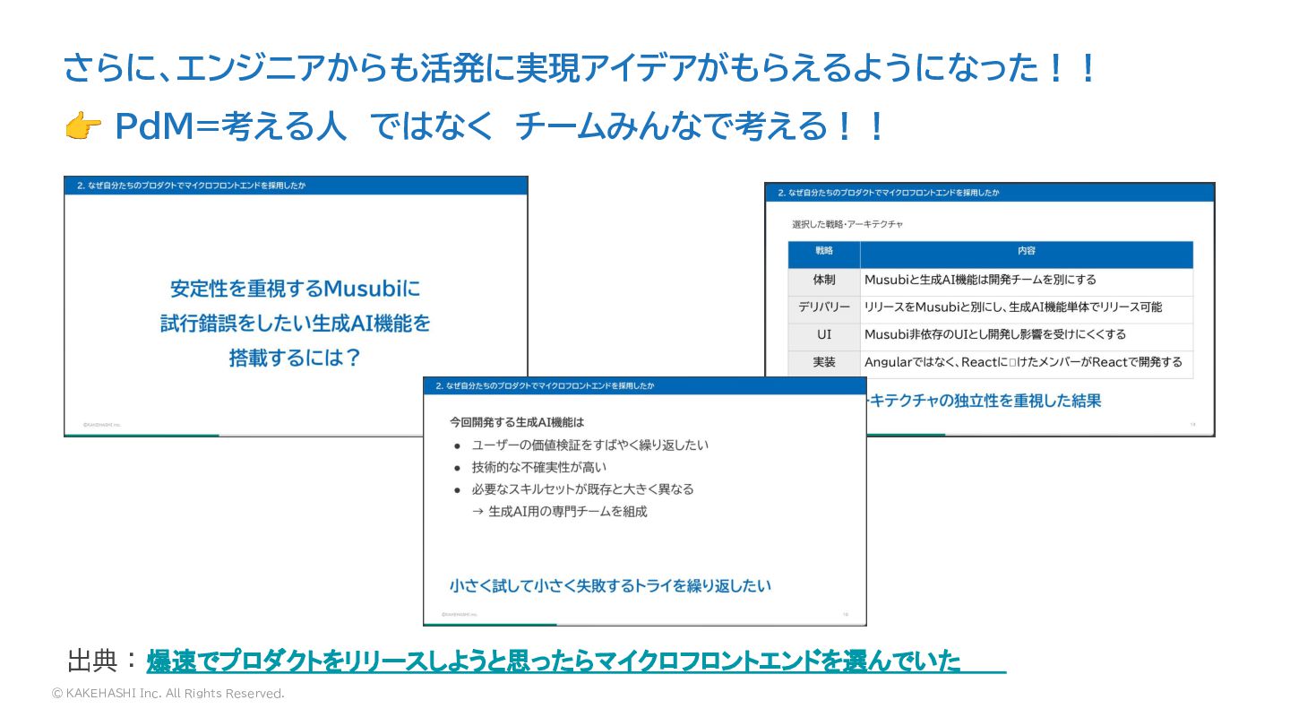 © KAKEHASHI Inc. All Rights Reserved. さらに、エンジニアからも活発に実現アイデアがもらえるようになった!! 👉 PdM=考える人 ではなく チームみんなで考える!! 出典