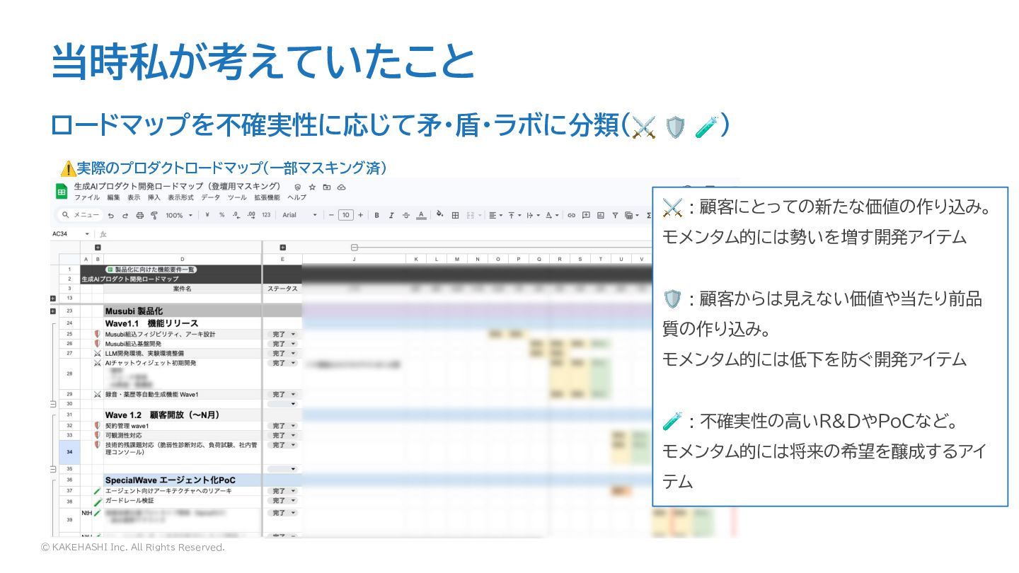 © KAKEHASHI Inc. All Rights Reserved. 当時私が考えていたこと ロードマップを不確実性に応じて矛・盾・ラボに分類(⚔ 🛡 🧪)