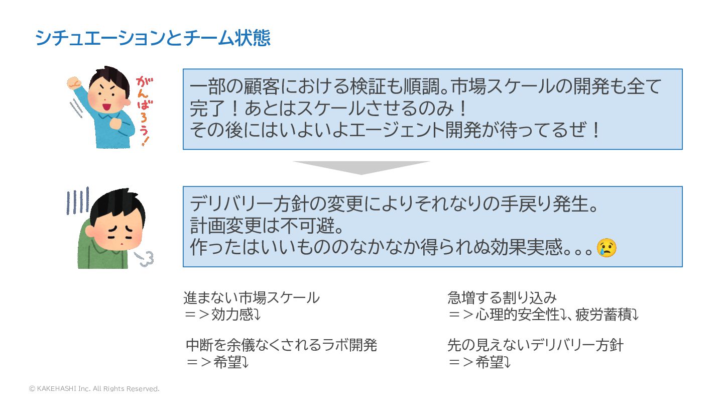 その後にはいよいよエージェント開発が待ってるぜ! デリバリー方針の変更によりそれなりの手戻り発生。 計画変更は不可避。 作ったはいいもののなかなか得られぬ効果実感。。。😢 シチュエーションとチーム状態 進まない市場スケール =>効力感⤵ 中断を余儀なくされるラボ開発 =>希望⤵ 急増する割り込み =>心理的安全性⤵、疲労蓄積⤵