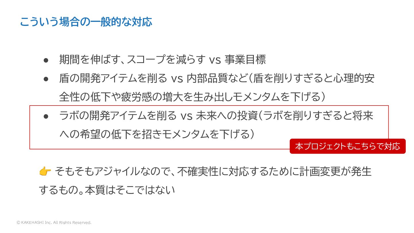 • 盾の開発アイテムを削る vs 内部品質など(盾を削りすぎると心理的安 全性の低下や疲労感の増大を生み出しモメンタムを下げる) • ラボの開発アイテムを削る vs 未来への投資(ラボを削りすぎると将来 への希望の低下を招きモメンタムを下げる) 👉 そもそもアジャイルなので、不確実性に対応するために計画変更が発生 するもの。本質はそこではない こういう場合の一般的な対応 本プロジェクトもこちらで対応