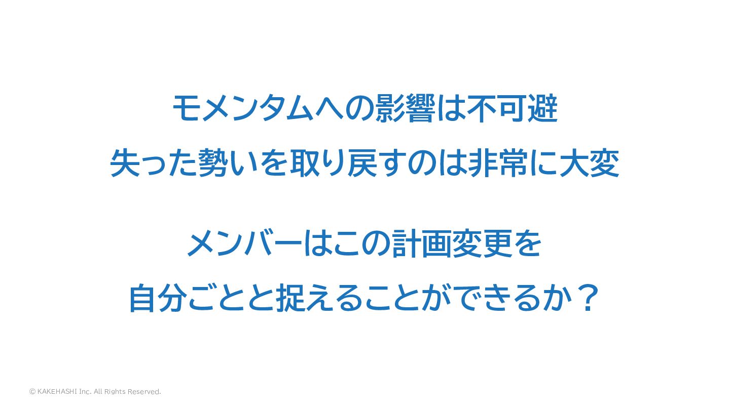 © KAKEHASHI Inc. All Rights Reserved. モメンタムへの影響は不可避 失った勢いを取り戻すのは非常に大変 メンバーはこの計画変更を 自分ごとと捉えることができるか?