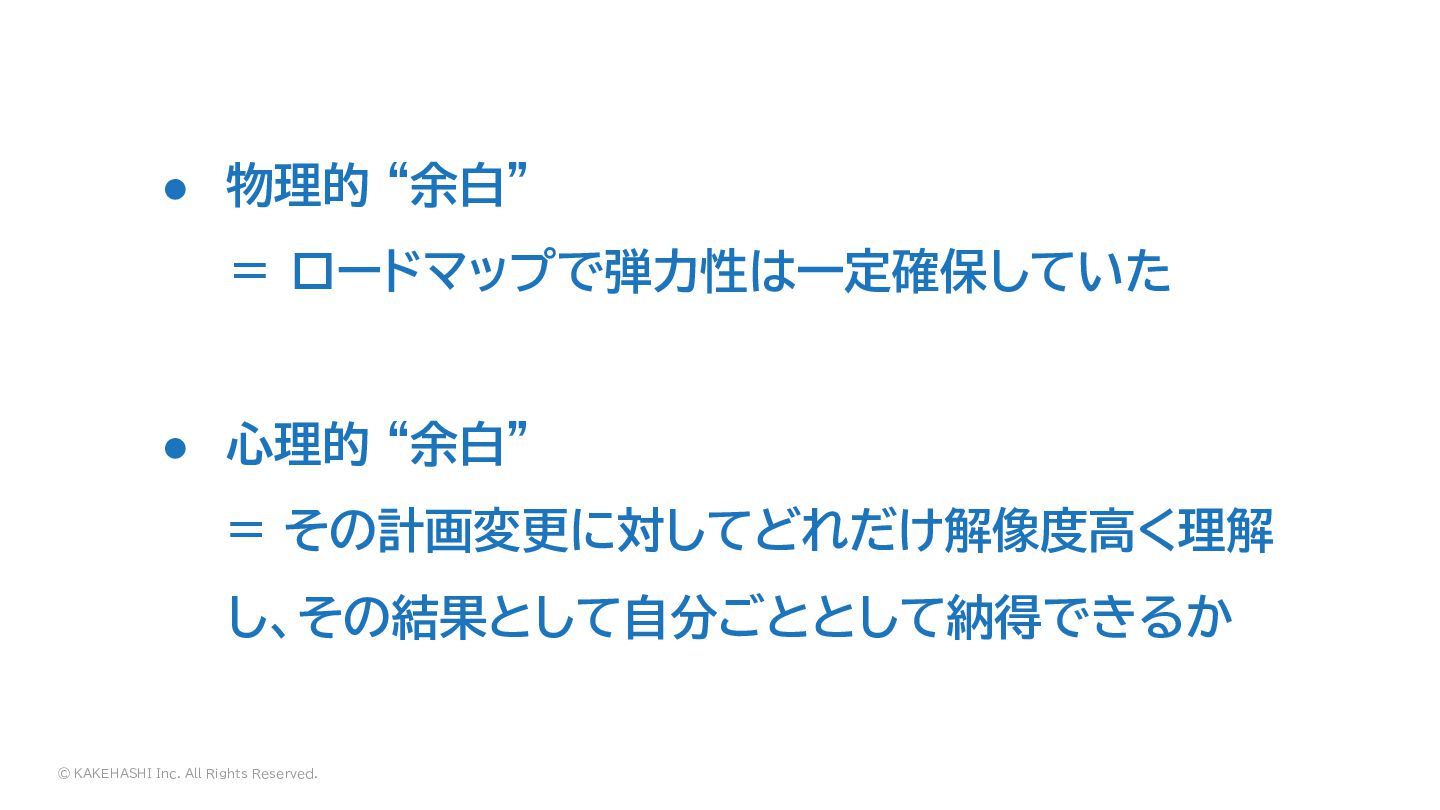 ロードマップで弾力性は一定確保していた • 心理的 “余白” = その計画変更に対してどれだけ解像度高く理解 し、その結果として自分ごととして納得できるか