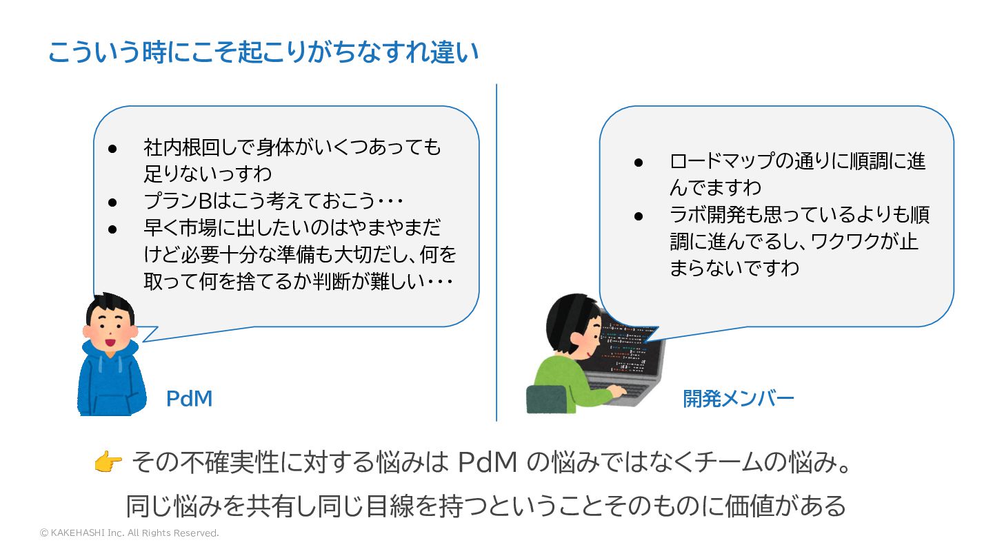 社内根回しで身体がいくつあっても 足りないっすわ • プランBはこう考えておこう・・・ • 早く市場に出したいのはやまやまだ けど必要十分な準備も大切だし、何を 取って何を捨てるか判断が難しい・・・ • ロードマップの通りに順調に進 んでますわ • ラボ開発も思っているよりも順 調に進んでるし、ワクワクが止 まらないですわ 👉 その不確実性に対する悩みは PdM の悩みではなくチームの悩み。 同じ悩みを共有し同じ目線を持つということそのものに価値がある