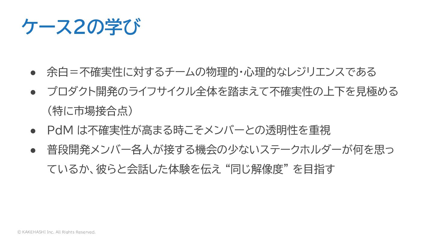 © KAKEHASHI Inc. All Rights Reserved. ケース2の学び • 余白=不確実性に対するチームの物理的・心理的なレジリエンスである •