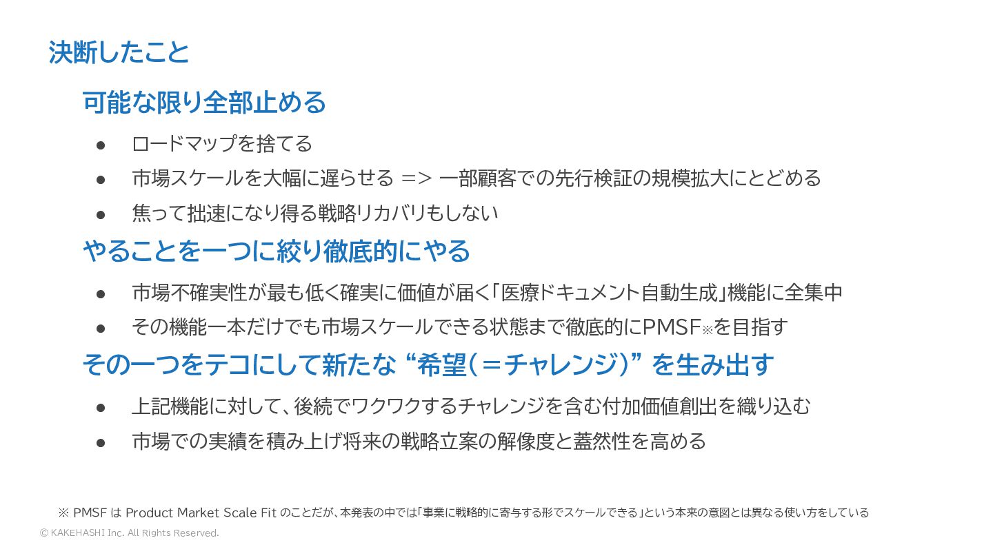 • 市場スケールを大幅に遅らせる => 一部顧客での先行検証の規模拡大にとどめる • 焦って拙速になり得る戦略リカバリもしない やることを一つに絞り徹底的にやる • 市場不確実性が最も低く確実に価値が届く「医療ドキュメント自動生成」機能に全集中 • その機能一本だけでも市場スケールできる状態まで徹底的にPMSF※ を目指す その一つをテコにして新たな “希望(=チャレンジ)” を生み出す • 上記機能に対して、後続でワクワクするチャレンジを含む付加価値創出を織り込む • 市場での実績を積み上げ将来の戦略立案の解像度と蓋然性を高める ※ PMSF は Product Market Scale Fit のことだが、本発表の中では「事業に戦略的に寄与する形でスケールできる」という本来の意図とは異なる使い方をしている