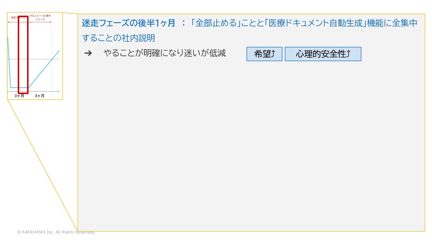 © KAKEHASHI Inc. All Rights Reserved. 迷走フェーズの後半1ヶ月 : 「全部止める」ことと「医療ドキュメント自動生成」機能に全集中 することの社内説明 ➔ やることが明確になり迷いが低減
