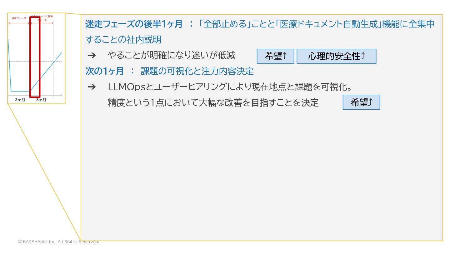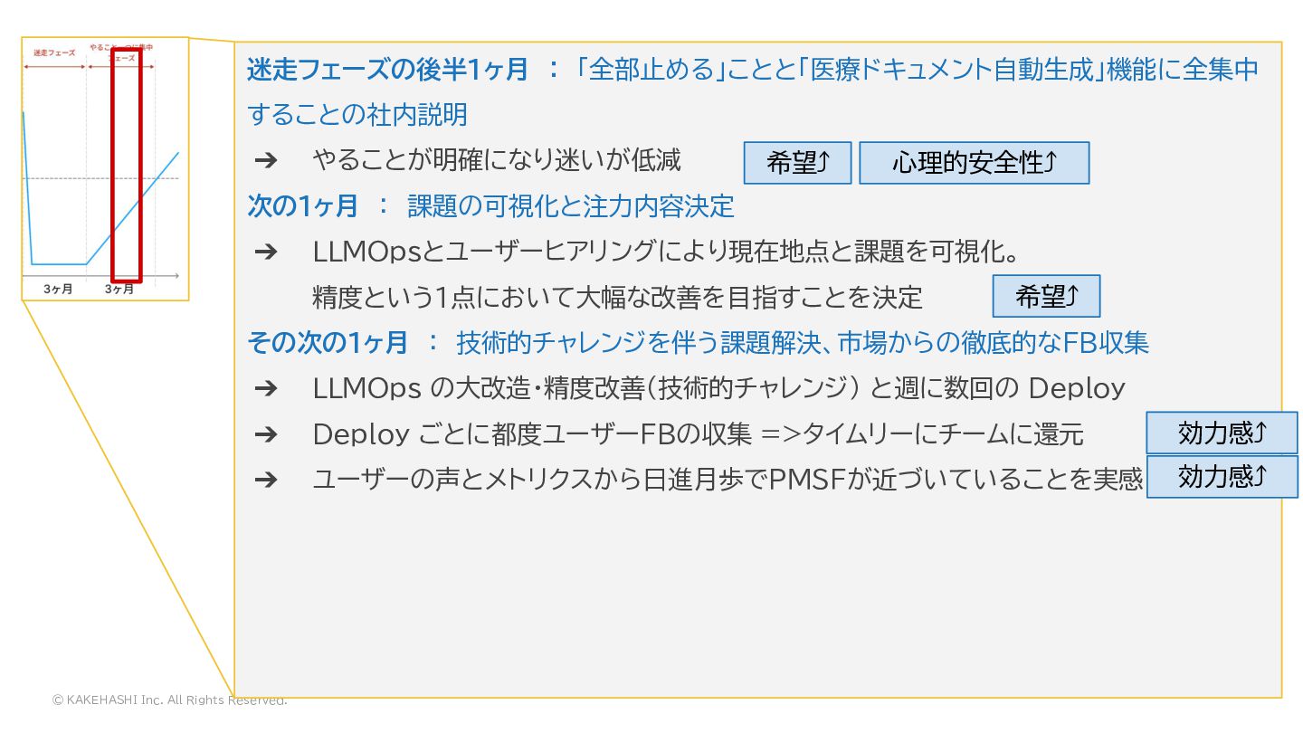 次の1ヶ月 : 課題の可視化と注力内容決定 ➔ LLMOpsとユーザーヒアリングにより現在地点と課題を可視化。 精度という1点において大幅な改善を目指すことを決定 その次の1ヶ月 : 技術的チャレンジを伴う課題解決、市場からの徹底的なFB収集 ➔ LLMOps の大改造・精度改善(技術的チャレンジ) と週に数回の Deploy ➔ Deploy ごとに都度ユーザーFBの収集 =>タイムリーにチームに還元 ➔ ユーザーの声とメトリクスから日進月歩でPMSFが近づいていることを実感 希望⤴ 希望⤴ 効力感⤴ 心理的安全性⤴ 効力感⤴