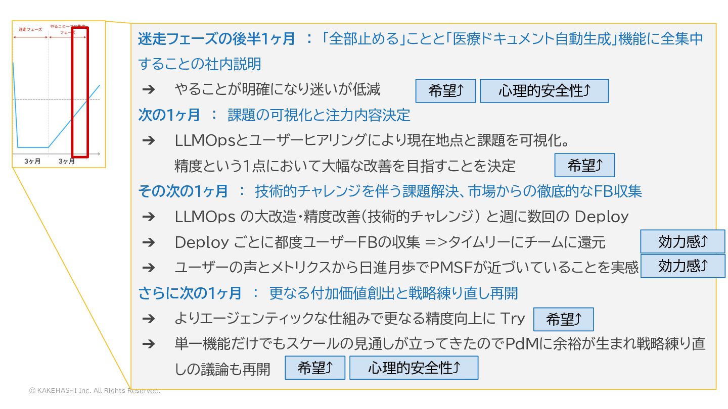 次の1ヶ月 : 課題の可視化と注力内容決定 ➔ LLMOpsとユーザーヒアリングにより現在地点と課題を可視化。 精度という1点において大幅な改善を目指すことを決定 その次の1ヶ月 : 技術的チャレンジを伴う課題解決、市場からの徹底的なFB収集 ➔ LLMOps の大改造・精度改善(技術的チャレンジ) と週に数回の Deploy ➔ Deploy ごとに都度ユーザーFBの収集 =>タイムリーにチームに還元 ➔ ユーザーの声とメトリクスから日進月歩でPMSFが近づいていることを実感 さらに次の1ヶ月 : 更なる付加価値創出と戦略練り直し再開 ➔ よりエージェンティックな仕組みで更なる精度向上に Try ➔ 単一機能だけでもスケールの見通しが立ってきたのでPdMに余裕が生まれ戦略練り直 しの議論も再開 希望⤴ 希望⤴ 効力感⤴ 希望⤴ 心理的安全性⤴ 効力感⤴ 希望⤴ 心理的安全性⤴