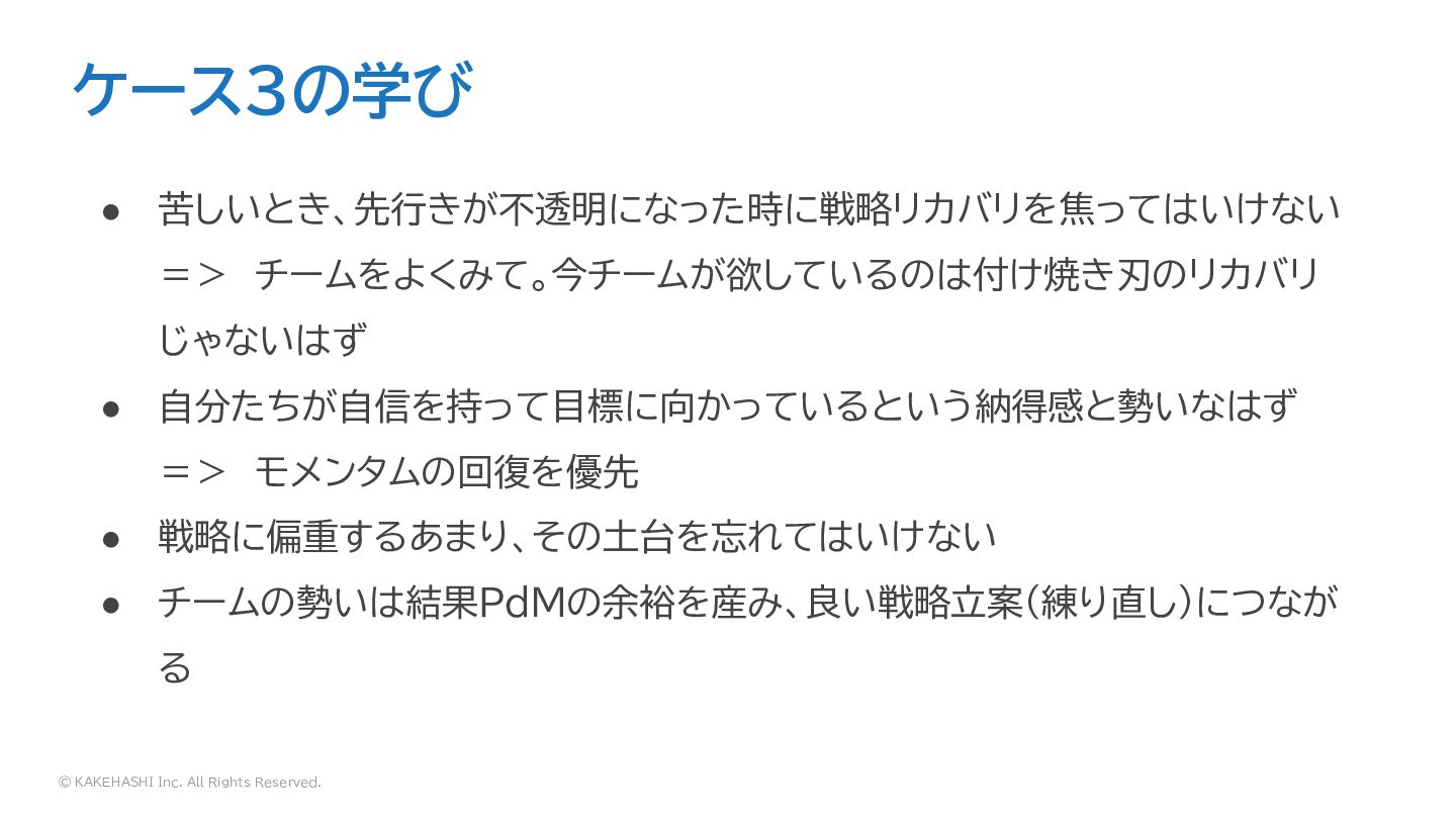 • 自分たちが自信を持って目標に向かっているという納得感と勢いなはず => モメンタムの回復を優先 • 戦略に偏重するあまり、その土台を忘れてはいけない • チームの勢いは結果PdMの余裕を産み、良い戦略立案(練り直し)につなが る ケース3の学び