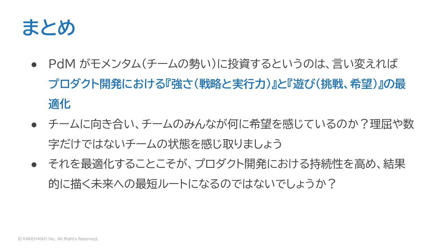 © KAKEHASHI Inc. All Rights Reserved. • PdM がモメンタム(チームの勢い)に投資するというのは、言い変えれば プロダクト開発における『強さ(戦略と実行力)』と『遊び(挑戦、希望)』の最