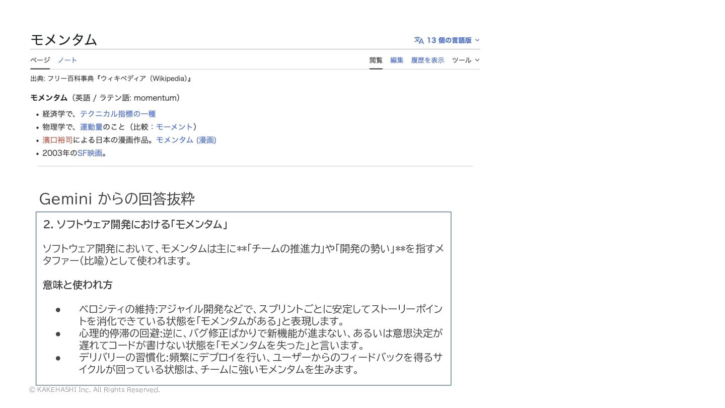© KAKEHASHI Inc. All Rights Reserved. 2. ソフトウェア開発における「モメンタム」 ソフトウェア開発において、モメンタムは主に**「チームの推進力」や「開発の勢い」**を指すメ タファー(比喩)として使われます。