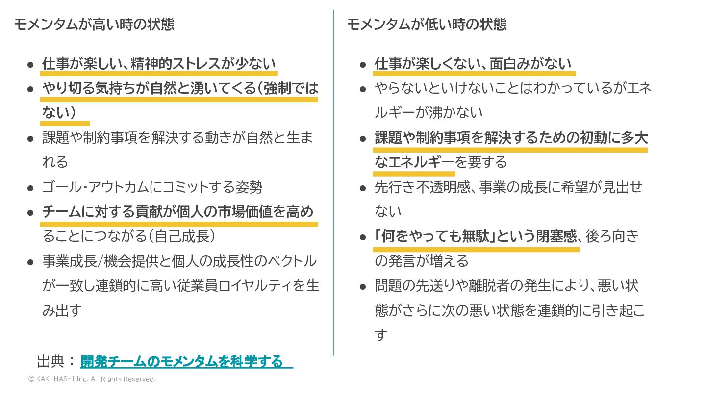 ルギーが沸かない • 課題や制約事項を解決するための初動に多大 なエネルギーを要する • 先行き不透明感、事業の成長に希望が見出せ ない • 「何をやっても無駄」という閉塞感、後ろ向き の発言が増える • 問題の先送りや離脱者の発生により、悪い状 態がさらに次の悪い状態を連鎖的に引き起こ す 出典 : 開発チームのモメンタムを科学する モメンタムが高い時の状態 モメンタムが低い時の状態 • 仕事が楽しい、精神的ストレスが少ない • やり切る気持ちが自然と湧いてくる(強制では ない) • 課題や制約事項を解決する動きが自然と生ま れる • ゴール・アウトカムにコミットする姿勢 • チームに対する貢献が個人の市場価値を高め ることにつながる(自己成長) • 事業成長/機会提供と個人の成長性のベクトル が一致し連鎖的に高い従業員ロイヤルティを生 み出す