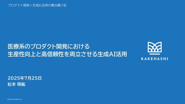 ©KAKEHASHI inc. 医療系のプロダクト開発における 生産性向上と高信頼性を両立させる生成AI活用 2025年7月25日 松本 明紘 プロダクト開発×生成AI活用の舞台裏LT会