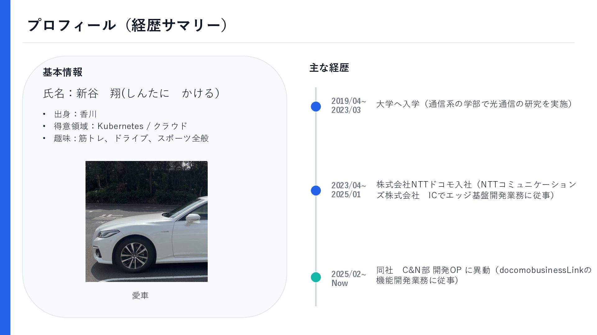 : 筋トレ、ドライブ、スポーツ全般 主な経歴 2023/04~ 2025/01 株式会社NTTドコモ入社(NTTコミュニケーション ズ株式会社 ICでエッジ基盤開発業務に従事) 2025/02~ Now 同社 C&N部 開発OP に異動(docomobusinessLinkの 機能開発業務に従事) 氏名:新谷 翔(しんたに かける) 愛車 大学へ入学(通信系の学部で光通信の研究を実施) 2019/04~ 2023/03