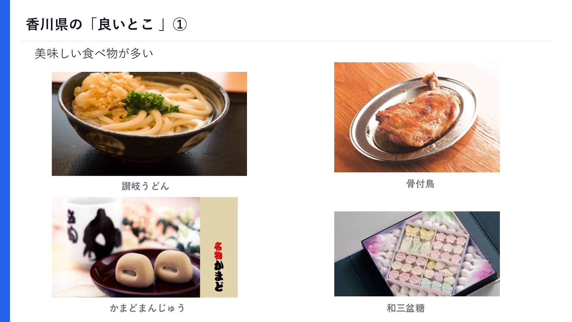 香川県の「良いとこ 」① 美味しい食べ物が多い 讃岐うどん 骨付鳥 かまどまんじゅう 和三盆糖