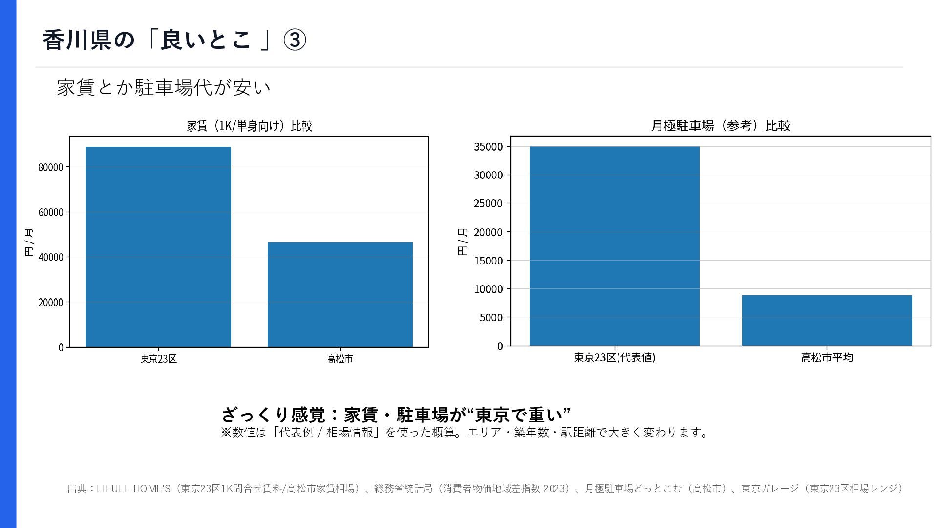 香川県の「良いとこ 」③ 家賃とか駐車場代が安い ざっくり感覚:家賃・駐車場が“東京で重い” ※数値は「代表例 / 相場情報」を使った概算。エリア・築年数・駅距離で大きく変わります。 出典:LIFULL HOME'S(東京23区1K問合せ賃料/高松市家賃相場)、総務省統計局(消費者物価地域差指数 2023)、月極駐車場どっとこむ(高松市)、東京ガレージ(東京23区相場レンジ)
