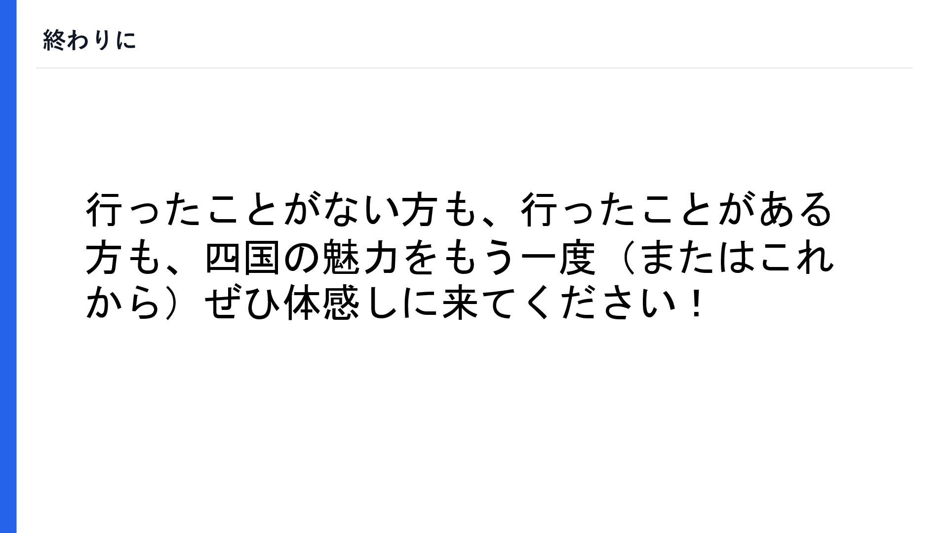 終わりに 行ったことがない方も、行ったことがある 方も、四国の魅力をもう一度(またはこれ から)ぜひ体感しに来てください!