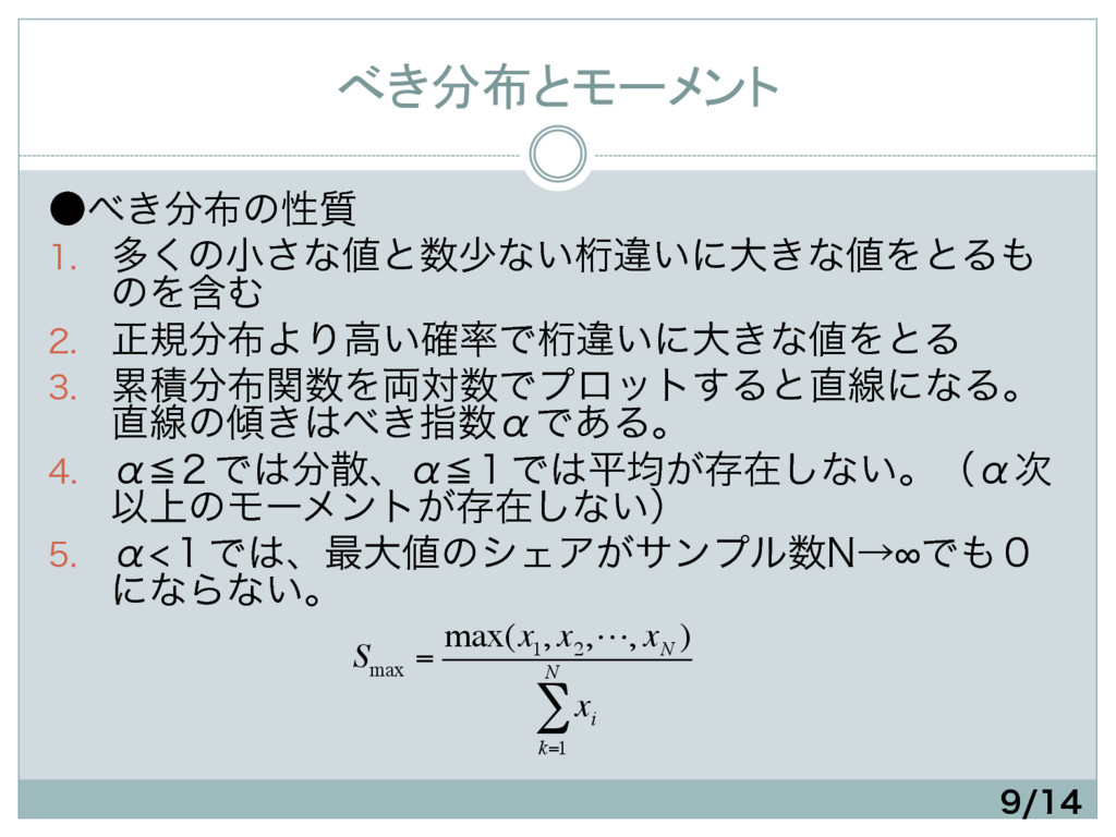 べき分布とモーメント ˔͖ͷੑ࣭ ଟ͘ͷখ͞ͳͱগͳ͍ܻҧ͍ʹେ͖ͳΛͱΔ ͷΛؚΉ ਖ਼نΑΓߴ͍֬Ͱܻҧ͍ʹେ͖ͳΛͱΔ ྦྷੵؔΛ྆ରͰϓϩοτ͢ΔͱઢʹͳΔɻ ઢͷ͖͖ࢦЋͰ͋Δɻ