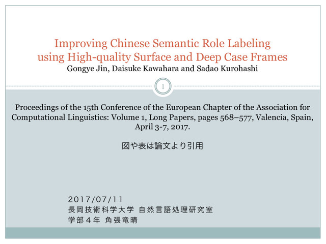 Ԭ ٕ ज़ Պ ֶ େ ֶ ࣗ વ ݴ ޠ ॲ ཧ ݚ ڀ ࣨ ֶ ෦ ̐ ֯ ு ཽ Improving Chinese Semantic Role Labeling using High-quality Surface and Deep Case Frames Gongye Jin, Daisuke Kawahara and Sadao Kurohashi Proceedings of the 15th Conference of the European Chapter of the Association for Computational Linguistics: Volume 1, Long Papers, pages 568–577, Valencia, Spain, April 3-7, 2017. ਤදจΑΓҾ༻ 1