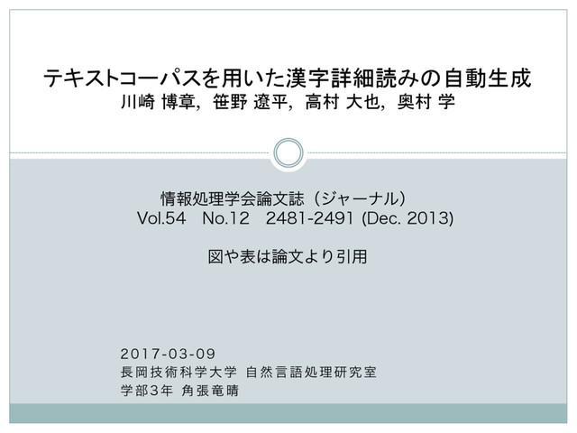 Ԭ ٕ ज़ Պ ֶ େ ֶ ࣗ વ ݴ ޠ ॲ ཧ ݚ ڀ ࣨ ֶ ෦ ֯ ு ཽ テキストコーパスを用いた漢字詳細読みの自動生成 川崎 博章, 笹野 遼平, 高村 大也, 奥村 学 ใॲཧֶձจࢽʢδϟʔφϧʣ ɹ7PMɹ/Pɹ %FD ਤදจΑΓҾ༻