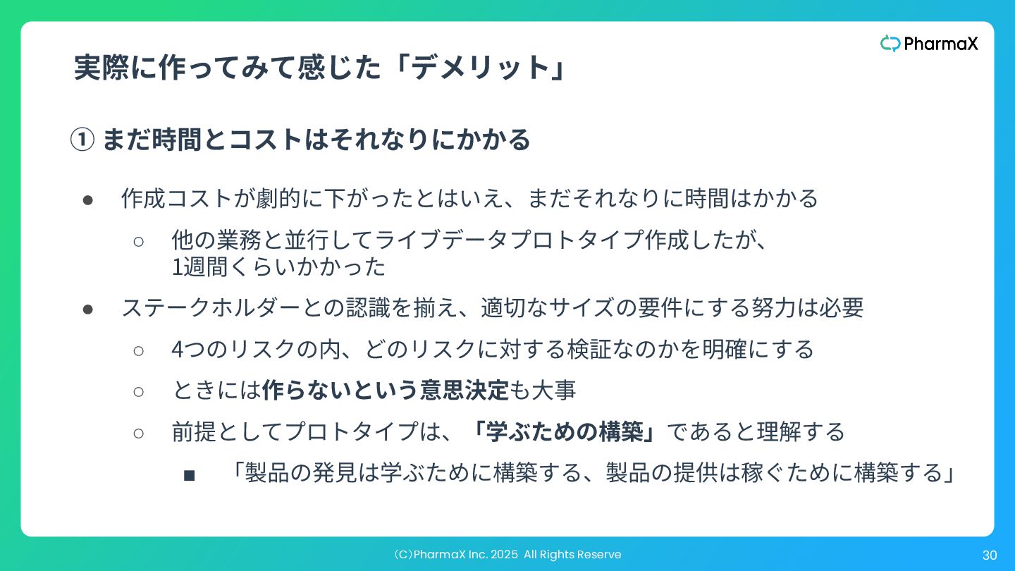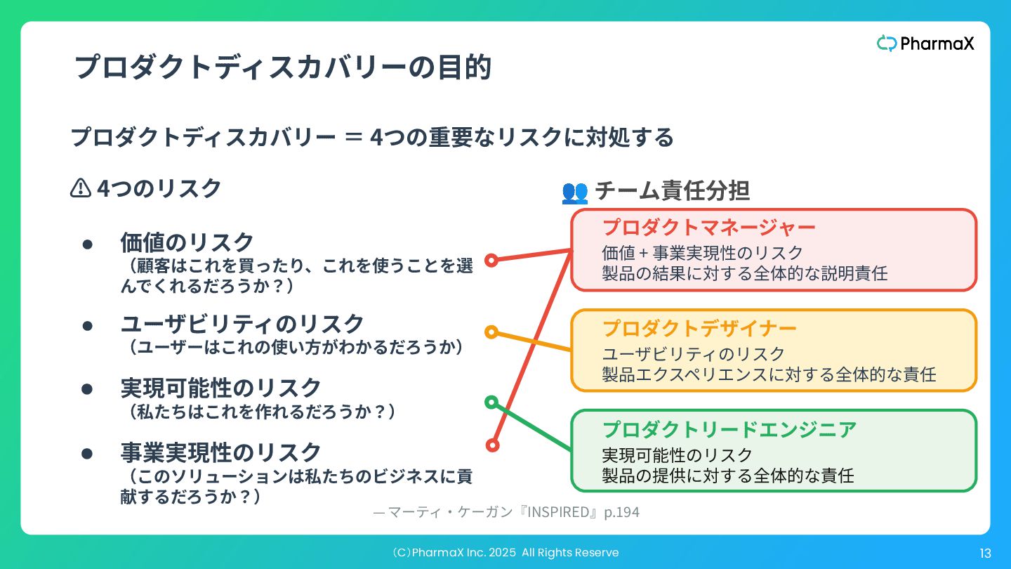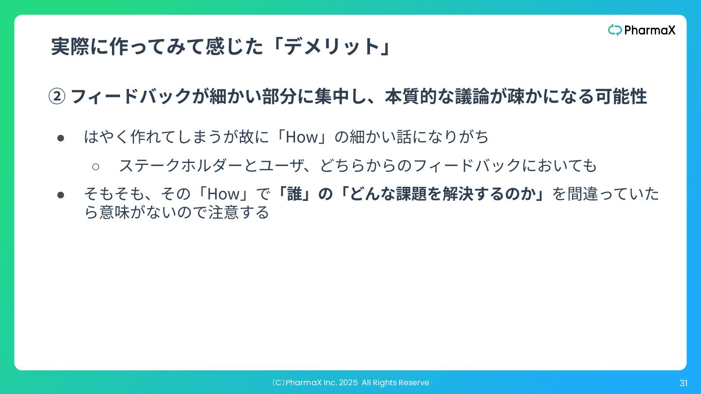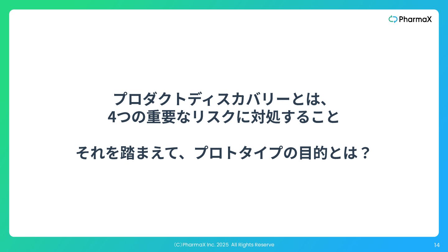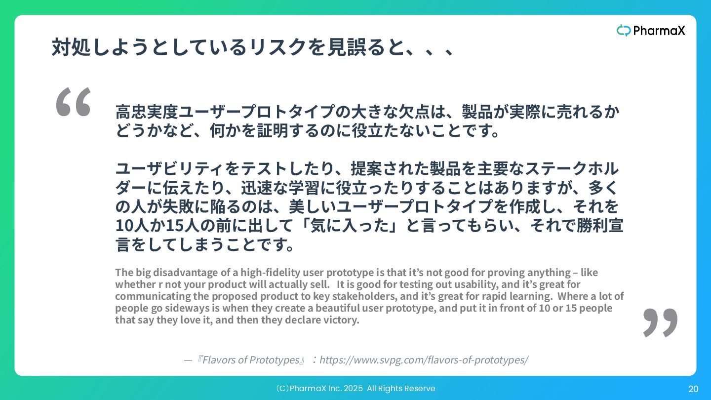 ダーに伝えたり、迅速な学習に役⽴ったりすることはありますが、多く の⼈が失敗に陥るのは、美しいユーザープロトタイプを作成し、それを 10⼈か15⼈の前に出して「気に⼊った」と⾔ってもらい、それで勝利宣 ⾔をしてしまうことです。 “ ” The big disadvantage of a high-fidelity user prototype is that it’s not good for proving anything ‒ like whether r not your product will actually sell. It is good for testing out usability, and it’s great for communicating the proposed product to key stakeholders, and it’s great for rapid learning. Where a lot of people go sideways is when they create a beautiful user prototype, and put it in front of 10 or 15 people that say they love it, and then they declare victory. 対処しようとしているリスクを⾒誤ると、、、 —『Flavors of Prototypes』:https://www.svpg.com/flavors-of-prototypes/