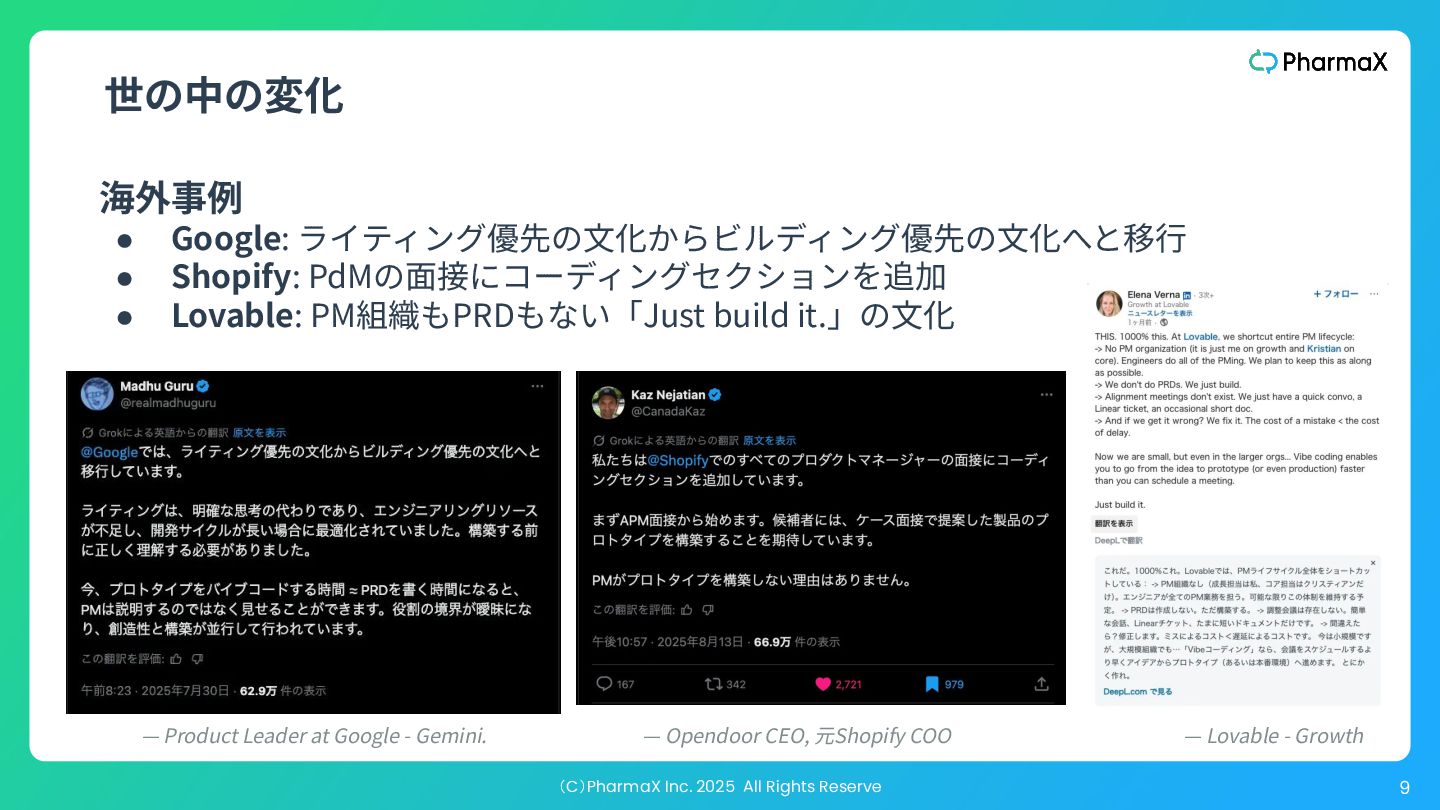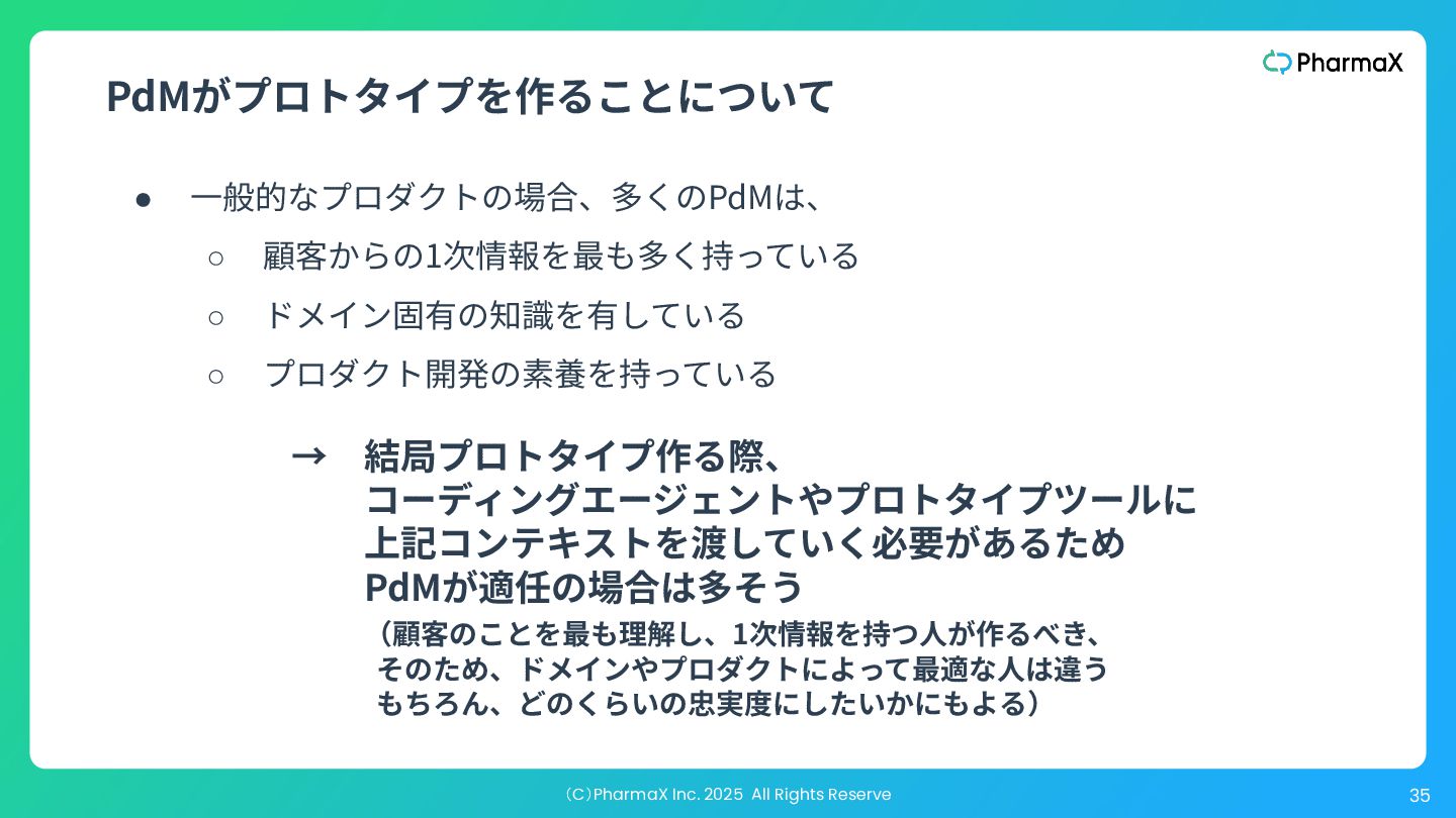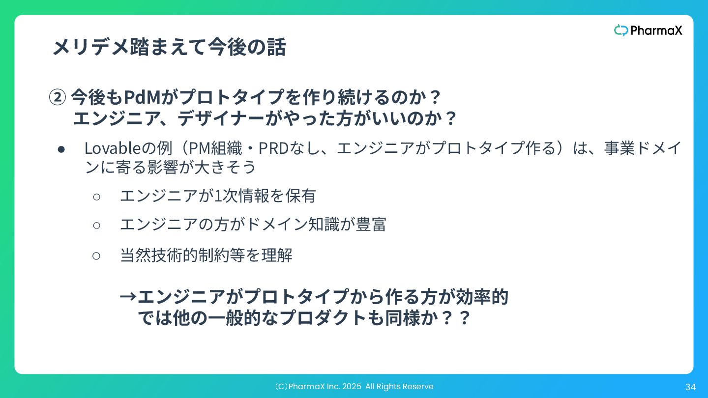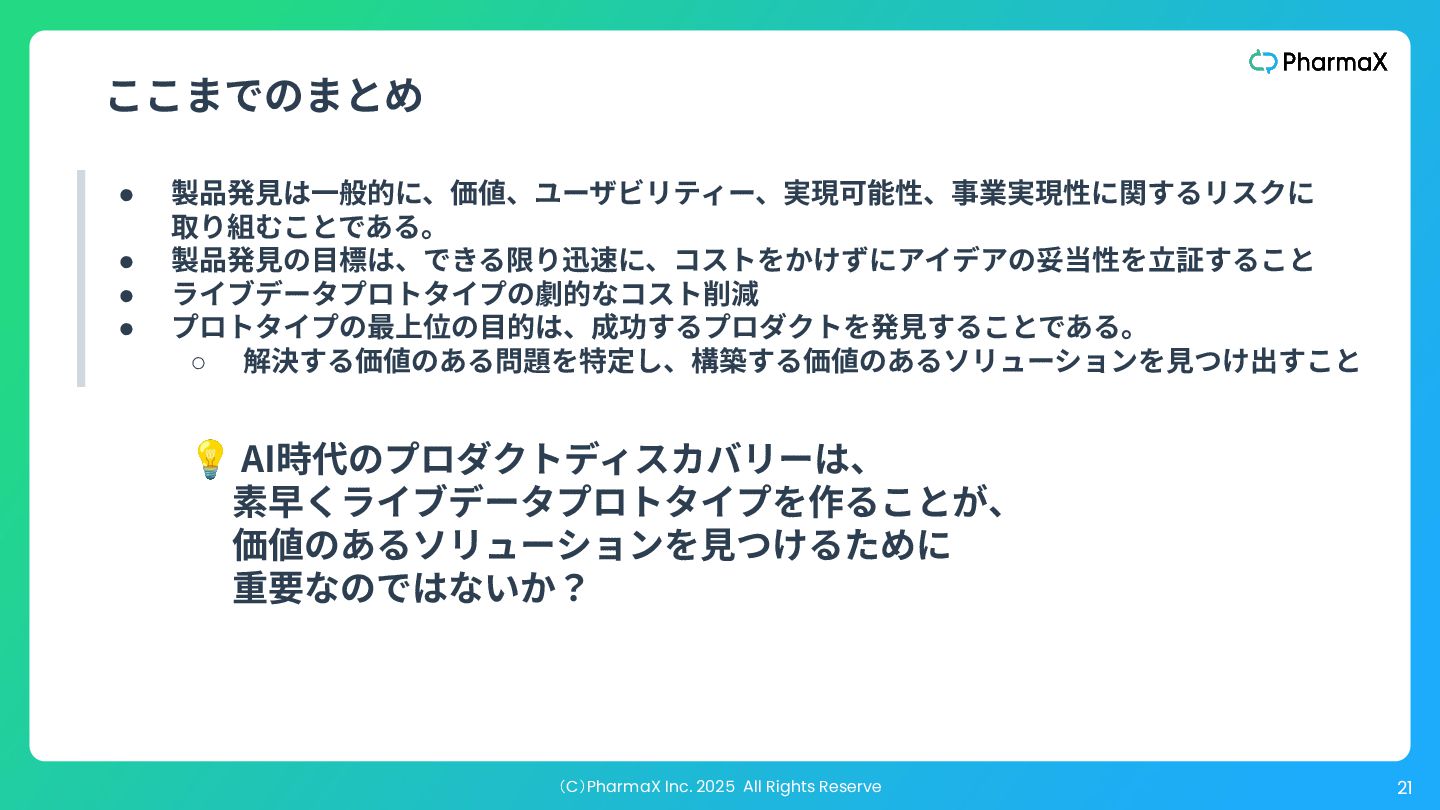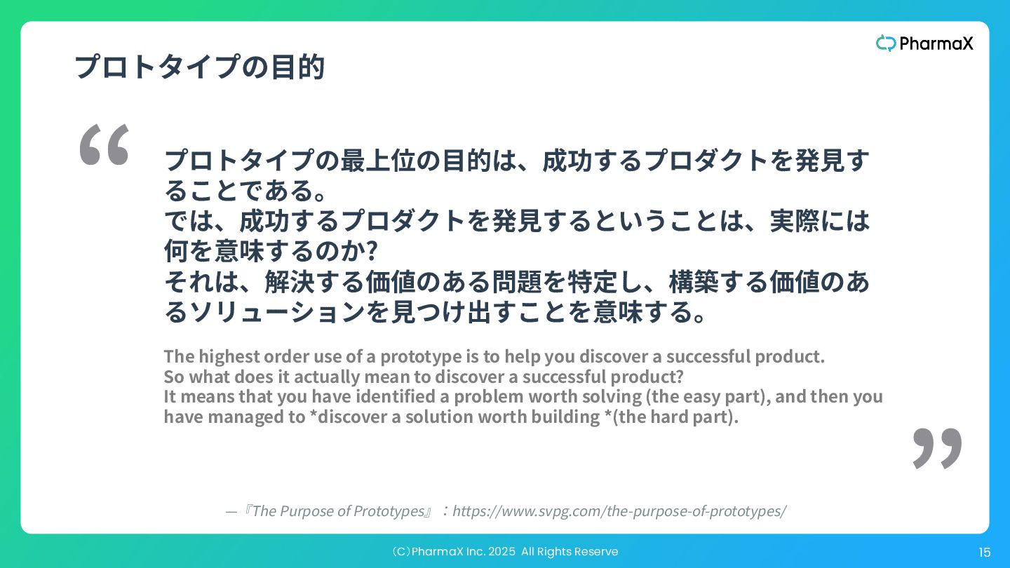 では、成功するプロダクトを発⾒するということは、実際には 何を意味するのか? それは、解決する価値のある問題を特定し、構築する価値のあ るソリューションを⾒つけ出すことを意味する。 “ ” The highest order use of a prototype is to help you discover a successful product. So what does it actually mean to discover a successful product? It means that you have identified a problem worth solving (the easy part), and then you have managed to *discover a solution worth building *(the hard part). —『The Purpose of Prototypes』:https://www.svpg.com/the-purpose-of-prototypes/