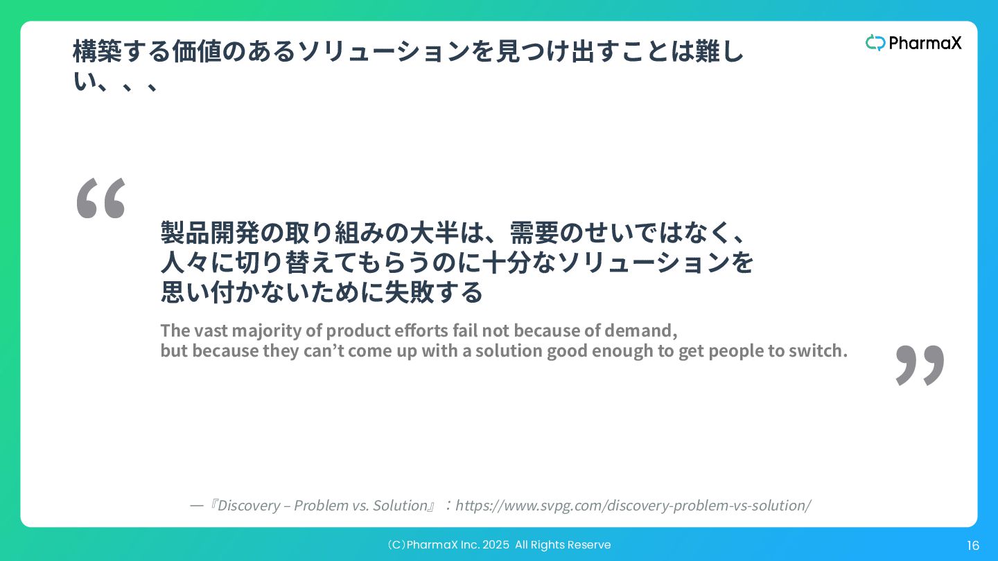 ⼈々に切り替えてもらうのに⼗分なソリューションを 思い付かないために失敗する “ ” The vast majority of product efforts fail not because of demand, but because they can’t come up with a solution good enough to get people to switch. —『Discovery ‒ Problem vs. Solution』:https://www.svpg.com/discovery-problem-vs-solution/