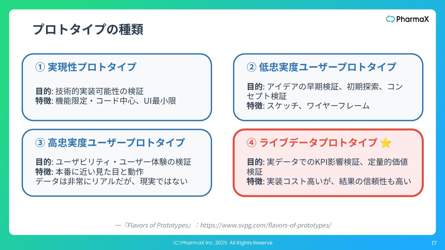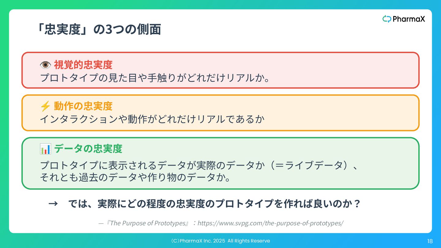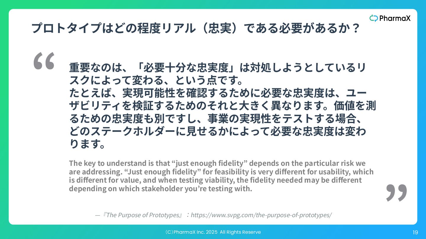 ザビリティを検証するためのそれと⼤きく異なります。価値を測 るための忠実度も別ですし、事業の実現性をテストする場合、 どのステークホルダーに⾒せるかによって必要な忠実度は変わ ります。 “ ” The key to understand is that “just enough fidelity” depends on the particular risk we are addressing. “Just enough fidelity” for feasibility is very different for usability, which is different for value, and when testing viability, the fidelity needed may be different depending on which stakeholder you’re testing with. —『The Purpose of Prototypes』:https://www.svpg.com/the-purpose-of-prototypes/ プロトタイプはどの程度リアル(忠実)である必要があるか?