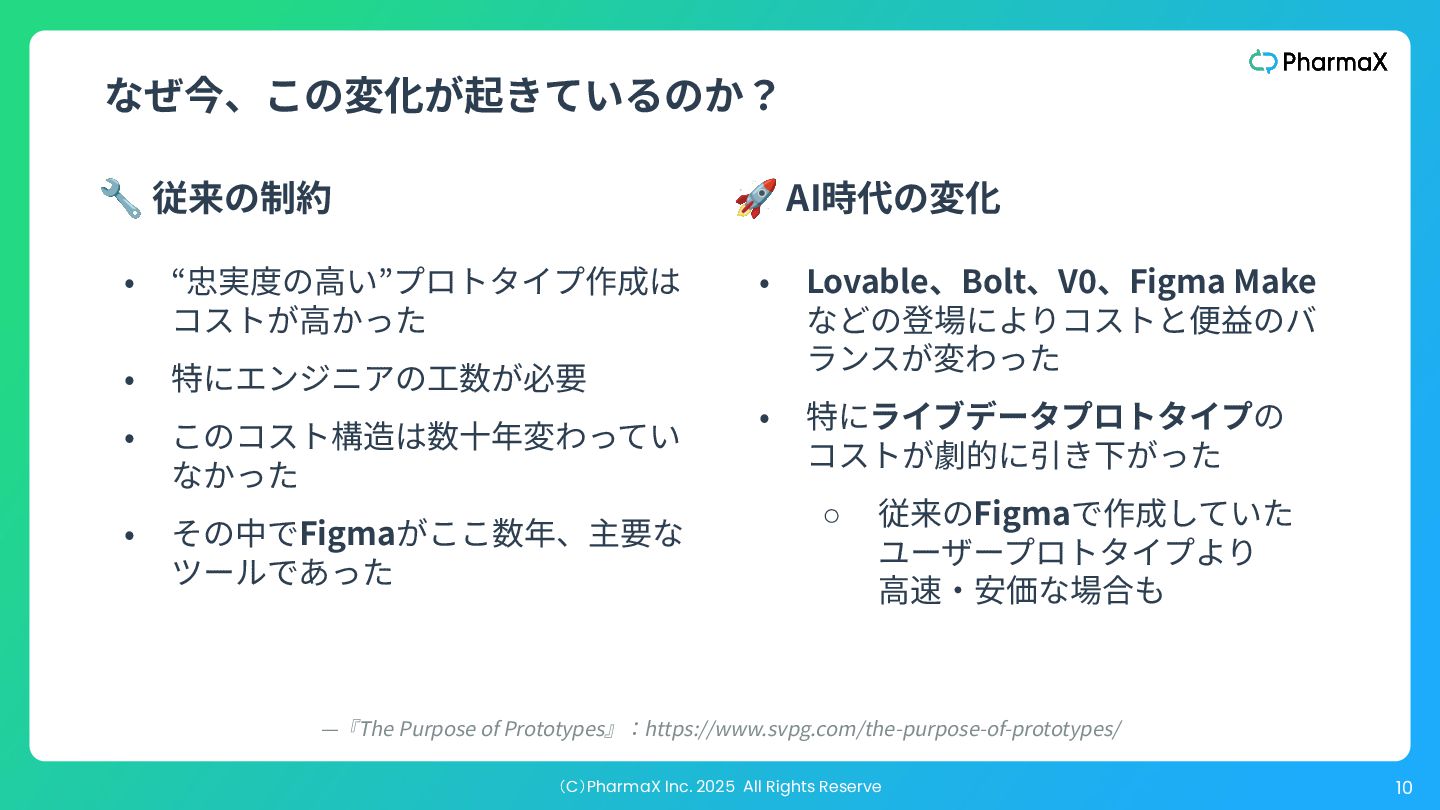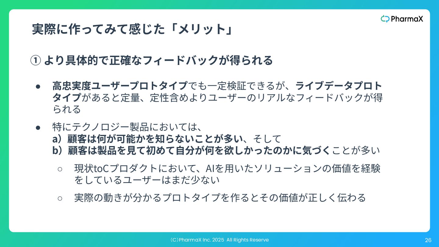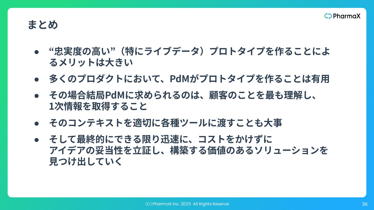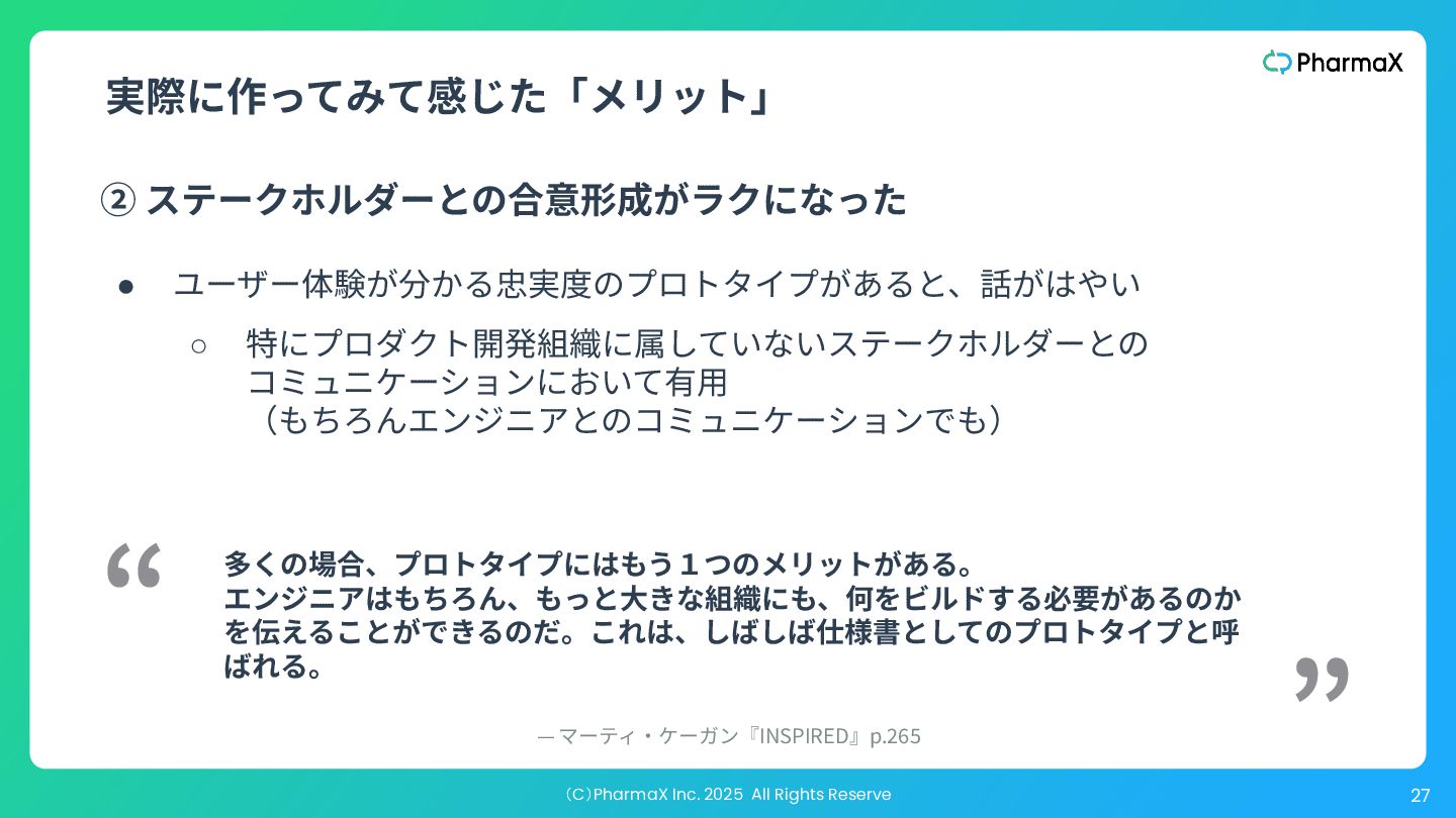 ザビリティを検証するためのそれと⼤きく異なります。価値を測 るための忠実度も別ですし、事業の実現性をテストする場合、 どのステークホルダーに⾒せるかによって必要な忠実度は変わ ります。 “ ” The key to understand is that “just enough fidelity” depends on the particular risk we are addressing. “Just enough fidelity” for feasibility is very different for usability, which is different for value, and when testing viability, the fidelity needed may be different depending on which stakeholder you’re testing with. —『The Purpose of Prototypes』:https://www.svpg.com/the-purpose-of-prototypes/ プロトタイプはどの程度リアル(忠実)である必要があるか?