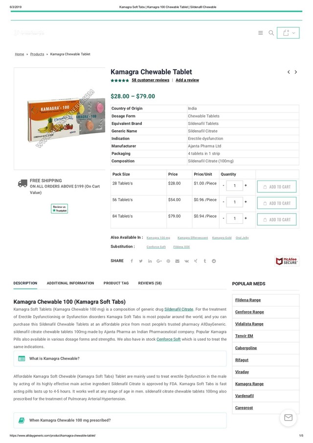 Kamagra soft tabs are 100mg pills which contain Sildenafil Citrate as effective constituents. Sildenafil is a prohibitor under the molecule PDE-5, effecting nitric oxide on the smooth muscles of the penis to expand blood flow.