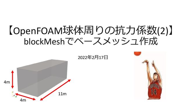 ymax #calc "-1.0*$ymin"; zmax #calc "-1.0*$zmin"; vertices ( ($xmin $ymin $zmin) //0 ($xmax $ymin $zmin) //1 ($xmax $ymax $zmin) //2 ($xmin $ymax $zmin) //3 ($xmin $ymin $zmax) //4 ($xmax $ymin $zmax) //5 ($xmax $ymax $zmax) //6 ($xmin $ymax $zmax) //7 ); blocks ( hex (0 1 2 3 4 5 6 7) (46 16 16) simpleGrading (1 1 1) ); edges (); blockMeshの設定 (8)変数を設定 座標のスケール ※単位はm (9)座標を指定 ※上で変数定義を行わずに数 値を書いても良い (10)各方向の分割数を指定 均一に分割 0 1 3 4 5 6 7 2 46分割 16分割 16分割 System/blockMeshDict を開いて編集を行う
