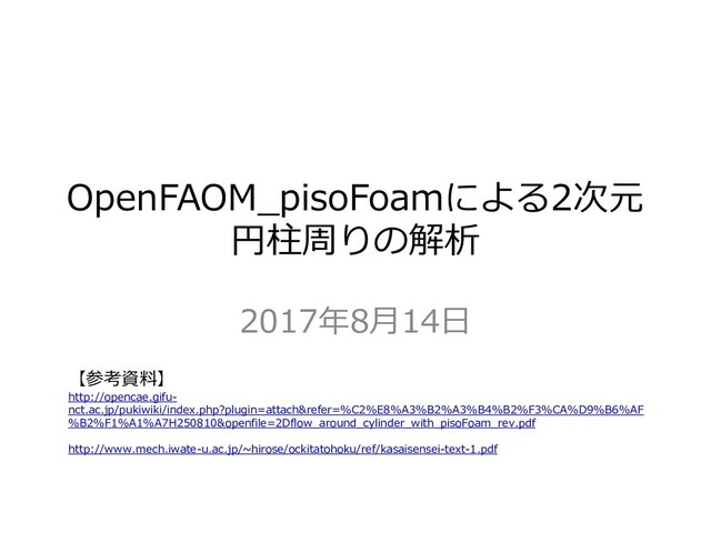 0; boundaryField { in { type fixedValue; value uniform 0; } out { type zeroGradient; } side { type fixedValue; value uniform 0; } front { type empty; } back { type empty; } cylinder { type zeroGradient; } } 0/p 圧力は指 定しない 圧力は指 定しない 圧力規定 圧力規定