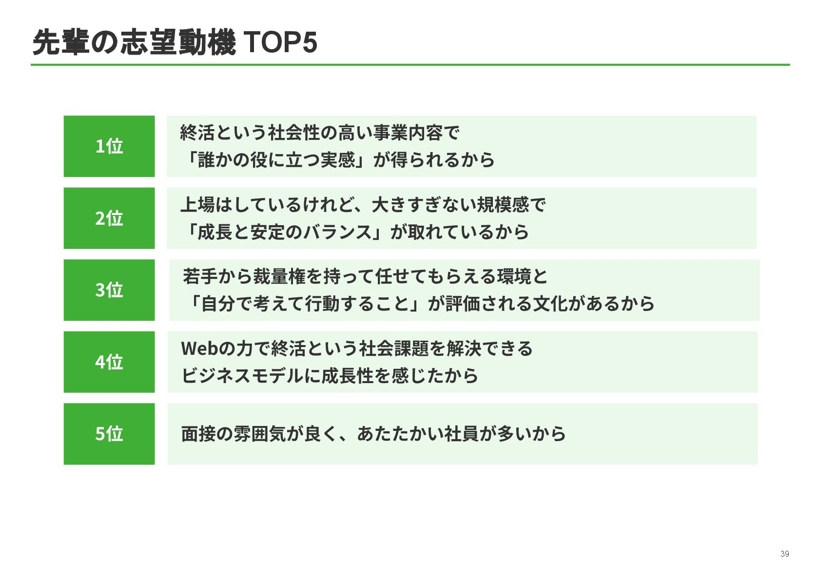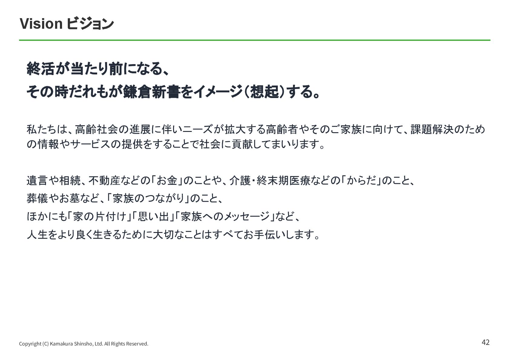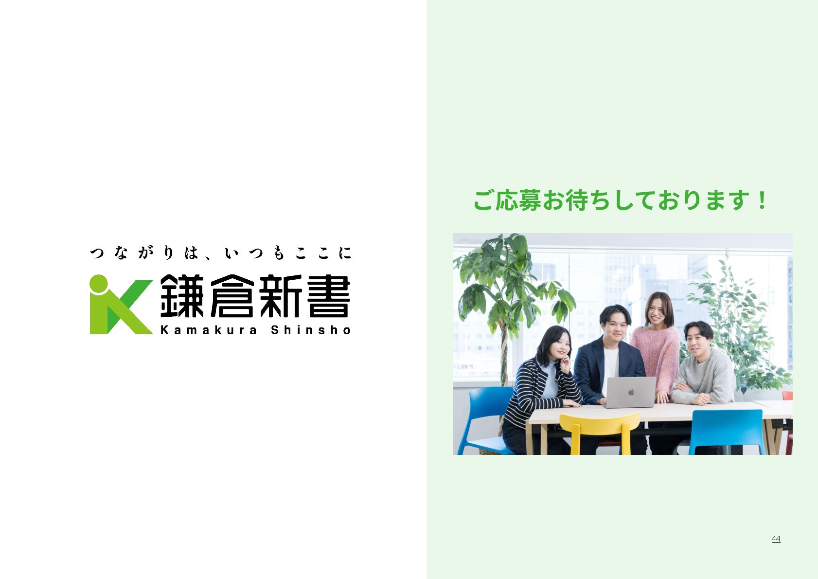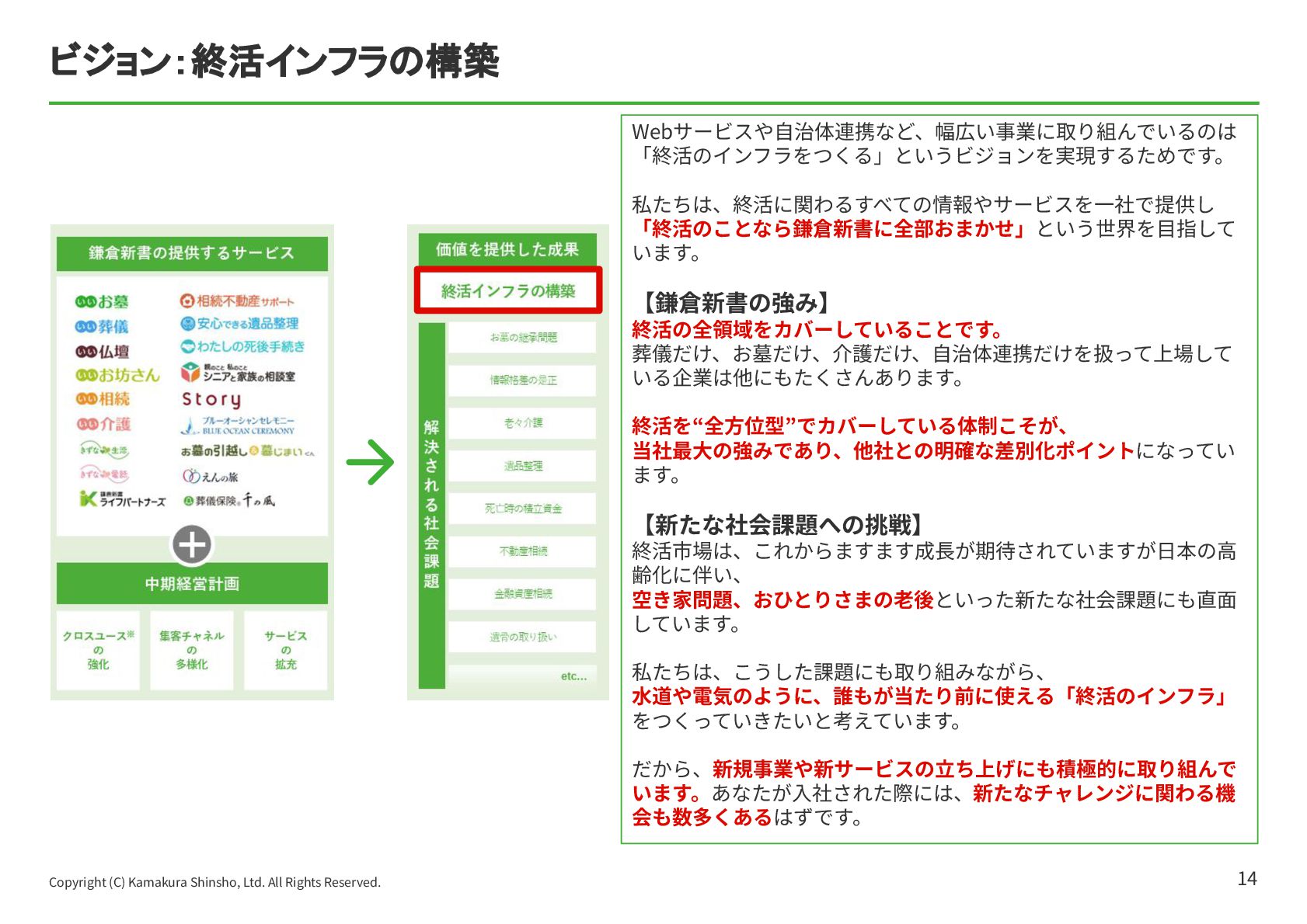 祐孝 代表取締役社⻑COO ⼩林 史⽣ 設⽴⽇ 1984年4⽉17⽇ 資本⾦ 10億5,802万円 所在地 本社:東京都中央区京橋2-14-1 兼松ビルディング3階 従業員数 319名(契約社員、パート、アルバイト含む)(フリーランス、業務委託を除く) 事業内容 ITメディア‧サービス事業 マッチングプラットフォームとなるポータルサイト運営を中⼼とした、終活に関わる情報サービスの提供 ⾃治体に対する⾼齢者領域での住⺠サービスの⽀援 グループ企業 株式会社ハウスボートクラブ、株式会社エイジプラス、株式会社鎌倉新書ライフパートナーズ、ベル少額短期保険株式会社、 ユウテル株式会社 会社概要 4 東京証券取引所の「プライム市場」に上場しており、「社会的に信頼されていて、しっかりしたルールのもとで運営されている会社」です。 【上場企業の特徴】 • 社会的信⽤があるので、⼤⼿企業や⾃治体と連携したビジネスができる • ⼈‧サービス‧働く環境への投資も積極的 鎌倉新書の社員数は約300名と⼤きすぎず、⼩さすぎない規模なので、若⼿のうちからチャンスがたくさんあります。 【鎌倉新書の特徴】 • 1年⽬からアイデアが採⽤される • 役員と近い距離で仕事ができる • 新規事業にも関われる 安定性と成⻑のチャンスの両⽅がある環境が、鎌倉新書にはあります。