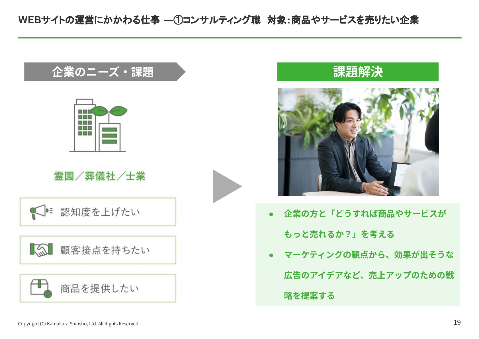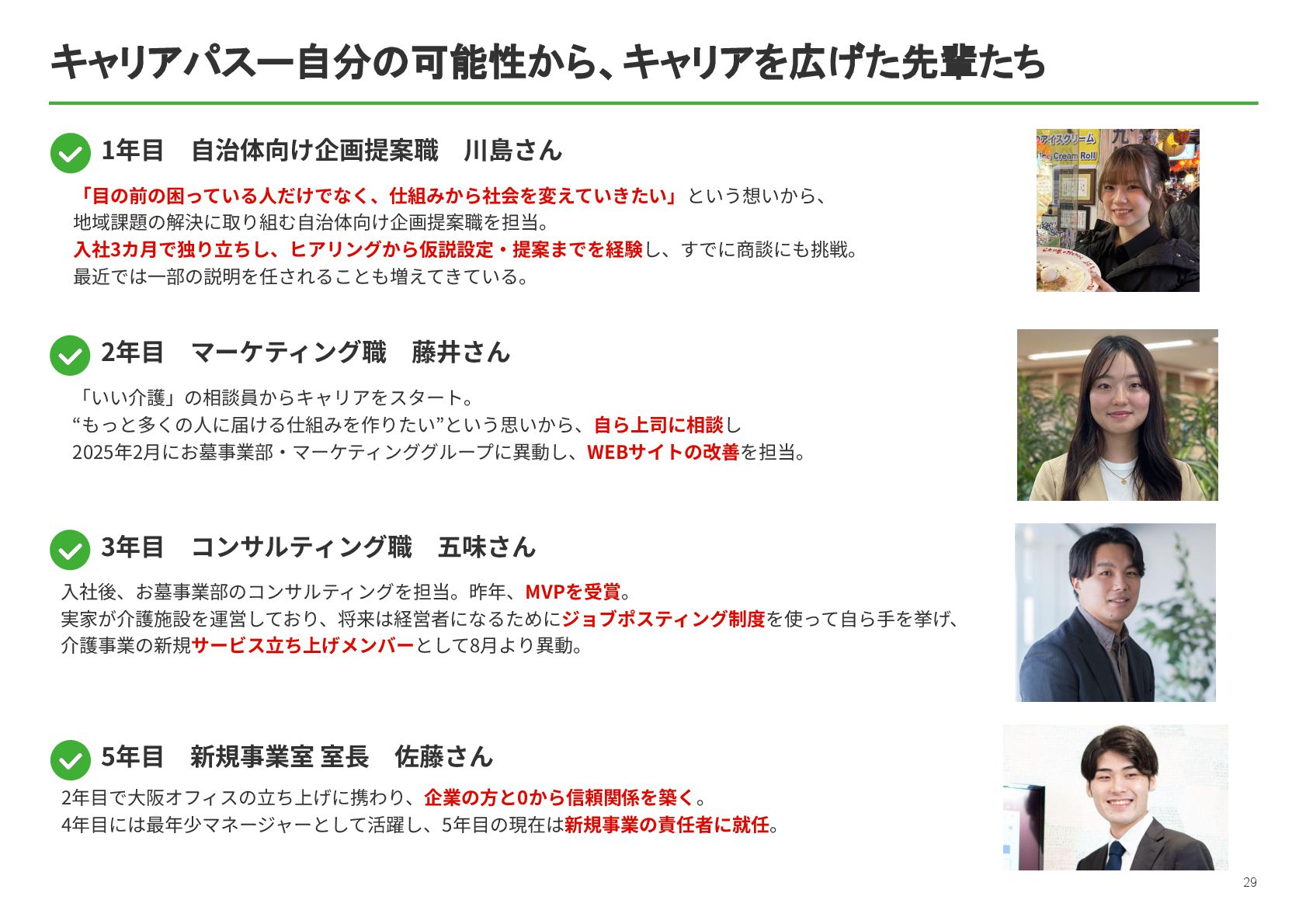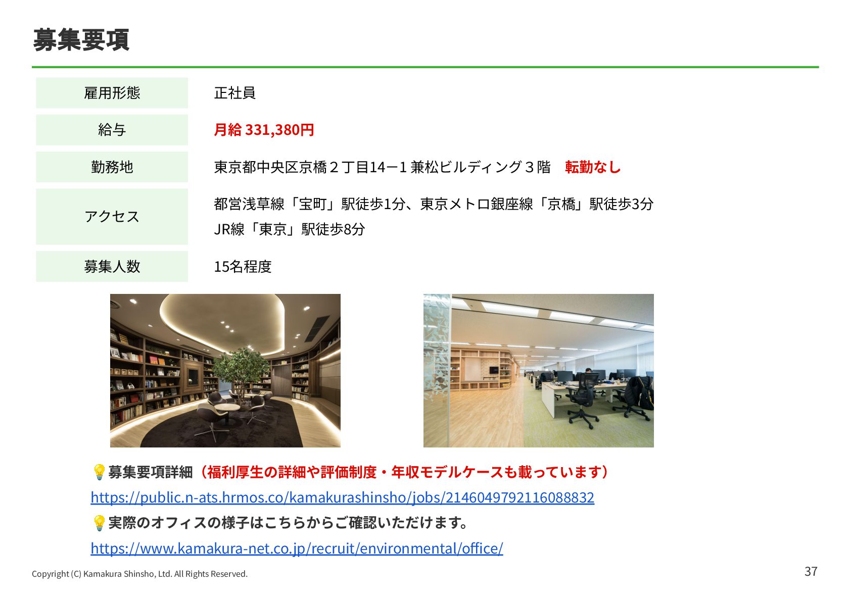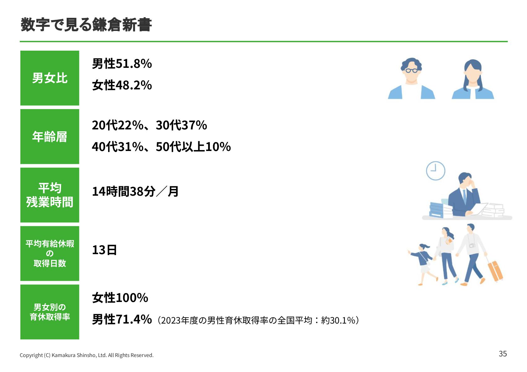 祐孝 代表取締役社⻑COO ⼩林 史⽣ 設⽴⽇ 1984年4⽉17⽇ 資本⾦ 10億5,802万円 所在地 本社:東京都中央区京橋2-14-1 兼松ビルディング3階 従業員数 319名(契約社員、パート、アルバイト含む)(フリーランス、業務委託を除く) 事業内容 ITメディア‧サービス事業 マッチングプラットフォームとなるポータルサイト運営を中⼼とした、終活に関わる情報サービスの提供 ⾃治体に対する⾼齢者領域での住⺠サービスの⽀援 グループ企業 株式会社ハウスボートクラブ、株式会社エイジプラス、株式会社鎌倉新書ライフパートナーズ、ベル少額短期保険株式会社、 ユウテル株式会社 会社概要 4 東京証券取引所の「プライム市場」に上場しており、「社会的に信頼されていて、しっかりしたルールのもとで運営されている会社」です。 【上場企業の特徴】 • 社会的信⽤があるので、⼤⼿企業や⾃治体と連携したビジネスができる • ⼈‧サービス‧働く環境への投資も積極的 鎌倉新書の社員数は約300名と⼤きすぎず、⼩さすぎない規模なので、若⼿のうちからチャンスがたくさんあります。 【鎌倉新書の特徴】 • 1年⽬からアイデアが採⽤される • 役員と近い距離で仕事ができる • 新規事業にも関われる 安定性と成⻑のチャンスの両⽅がある環境が、鎌倉新書にはあります。