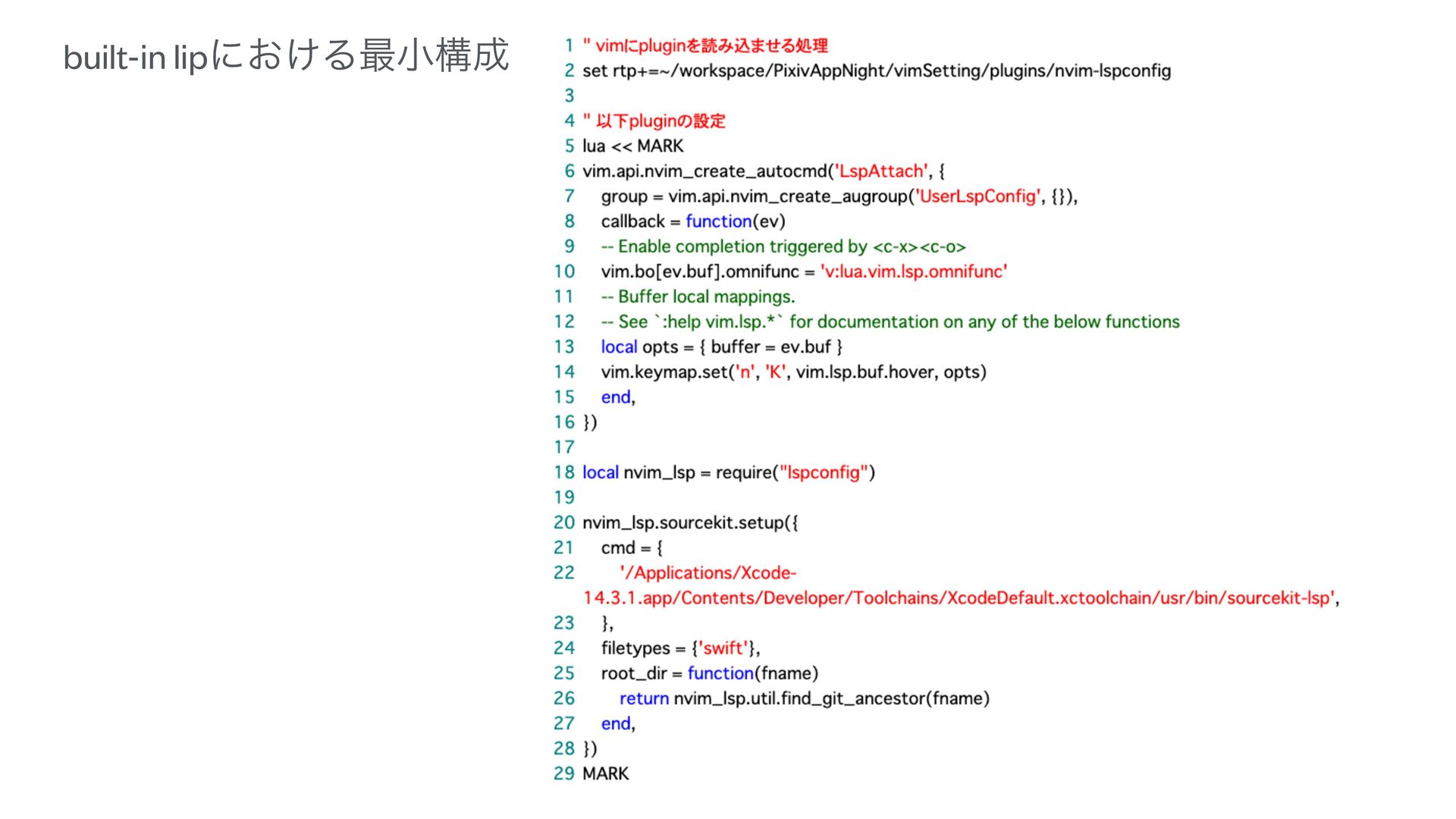 nvim-lspcon fi gΛ༻͍ͯsourcekit-lspΛೝࣝͤ͞Δ ௨ৗNBTTPOOWJNʢ-4ཧQMVHJOʣΛར༻ -4ݸผʹཧ͢ΔͷͰͳ͘ɺҰׅઃఆ͢Δ ϓϩδΣΫτSPPUΛHJUʹΑΓఆ