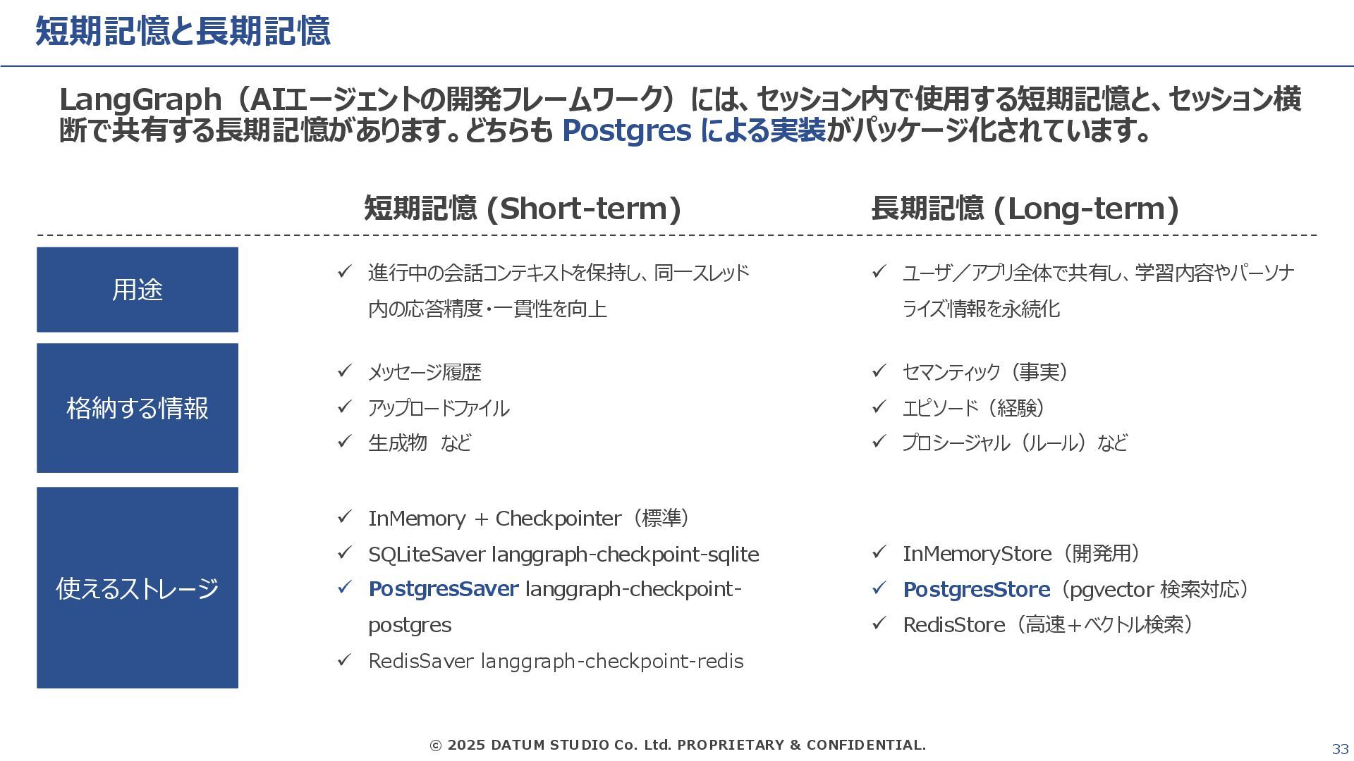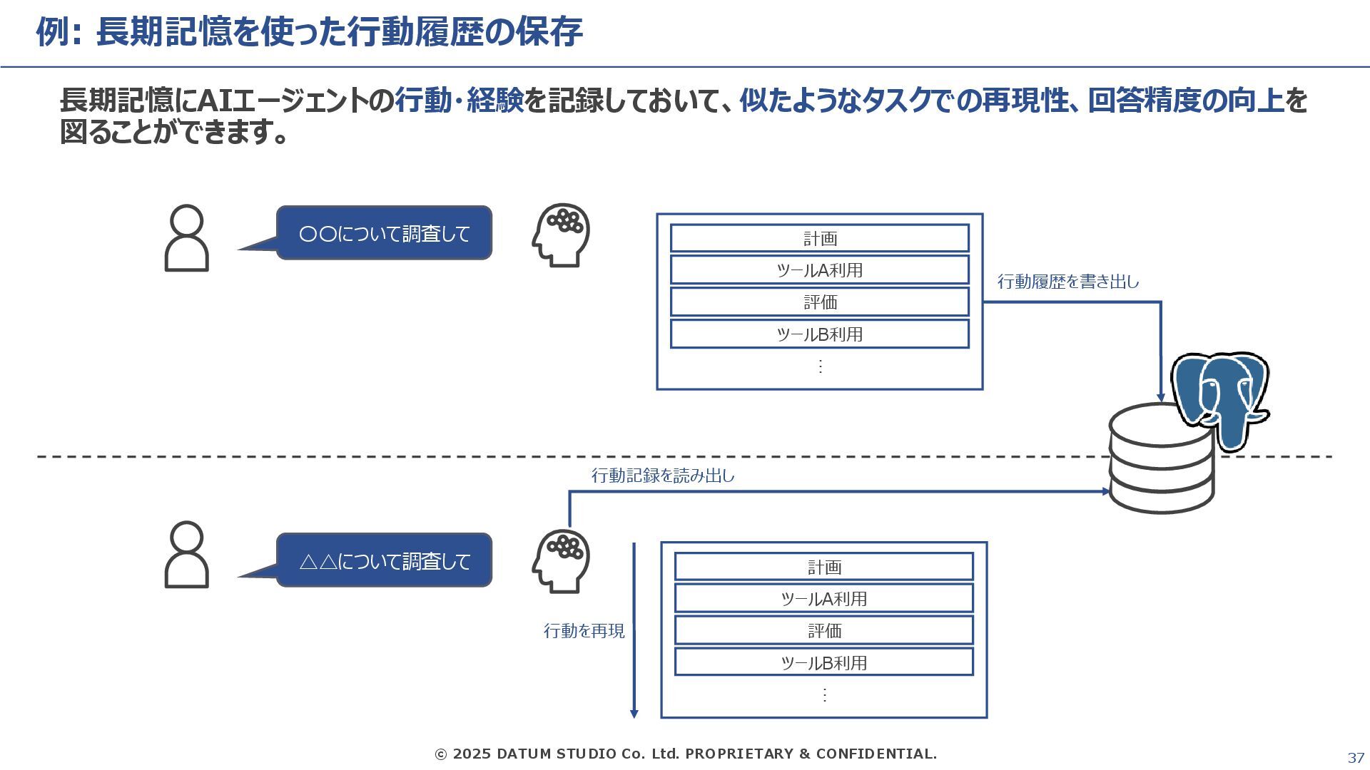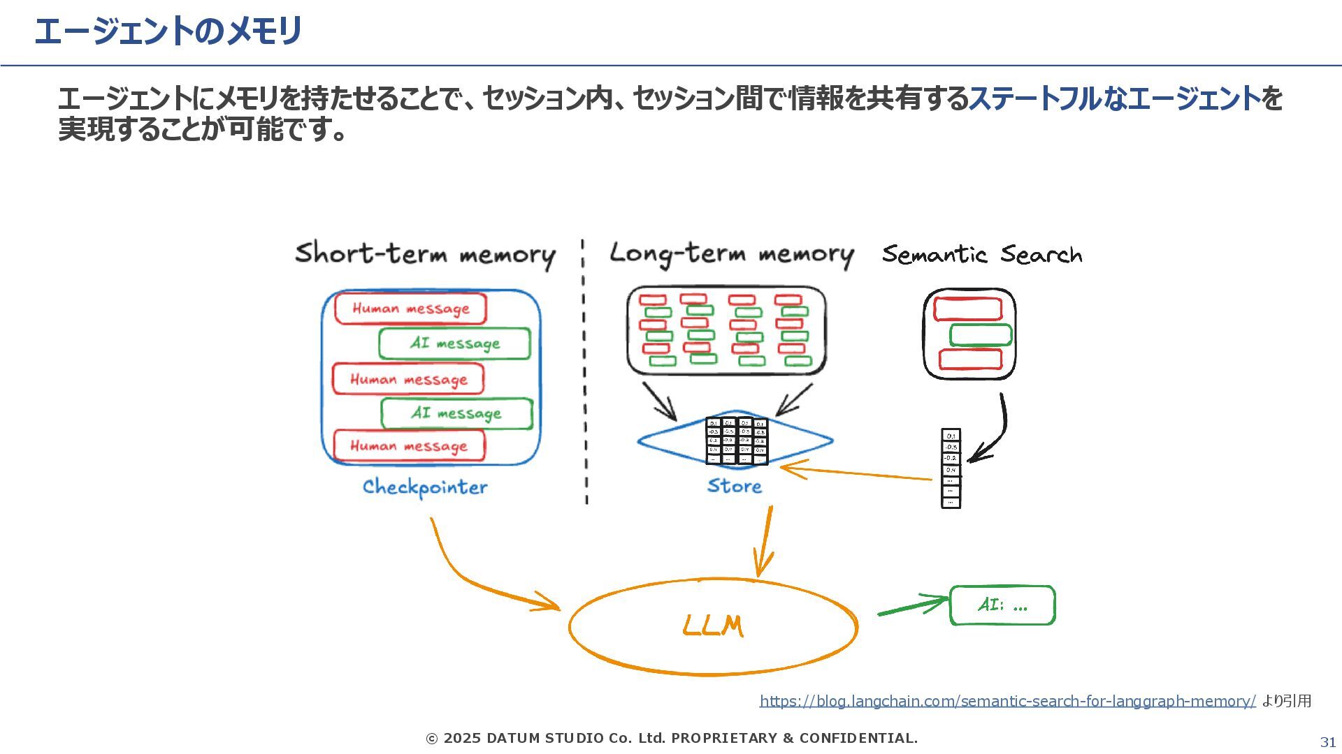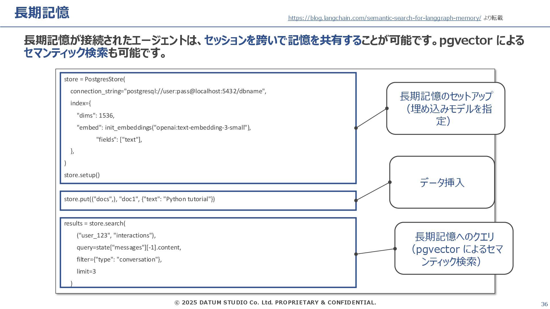 長期記憶 store = PostgresStore( connection_string="postgresql://user:pass@localhost:5432/dbname", index={ "dims": 1536, "embed": init_embeddings("openai:text-embedding-3-small"), "fields": ["text"], }, ) store.setup() store.put(("docs",), "doc1", {"text": "Python tutorial"}) results = store.search( ("user_123", "interactions"), query=state["messages"][-1].content, filter={"type": "conversation"}, limit=3 ) 長期記憶が接続されたエージェントは、セッションを跨いで記憶を共有することが可能です。pgvector による セマンティック検索も可能です。 長期記憶のセットアップ (埋め込みモデルを指 定) データ挿入 長期記憶へのクエリ (pgvector によるセマ ンティック検索) https://blog.langchain.com/semantic-search-for-langgraph-memory/ より転載