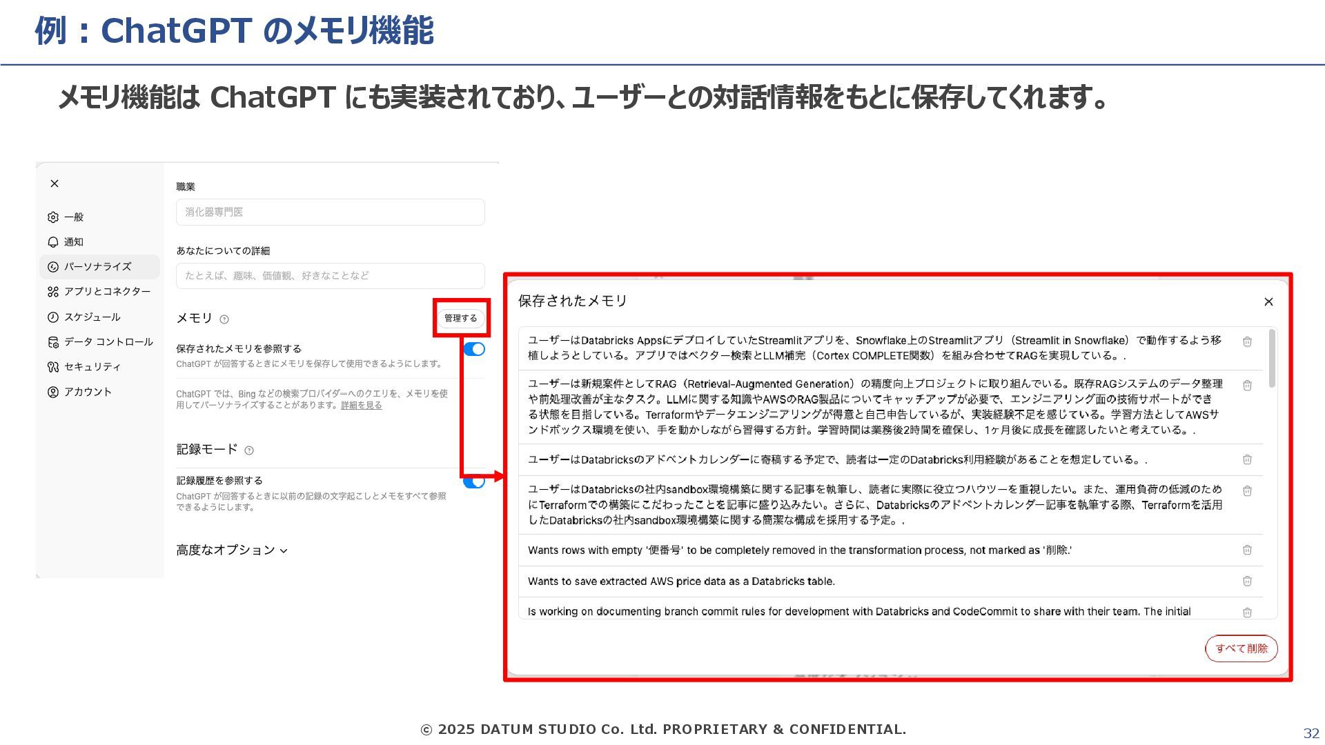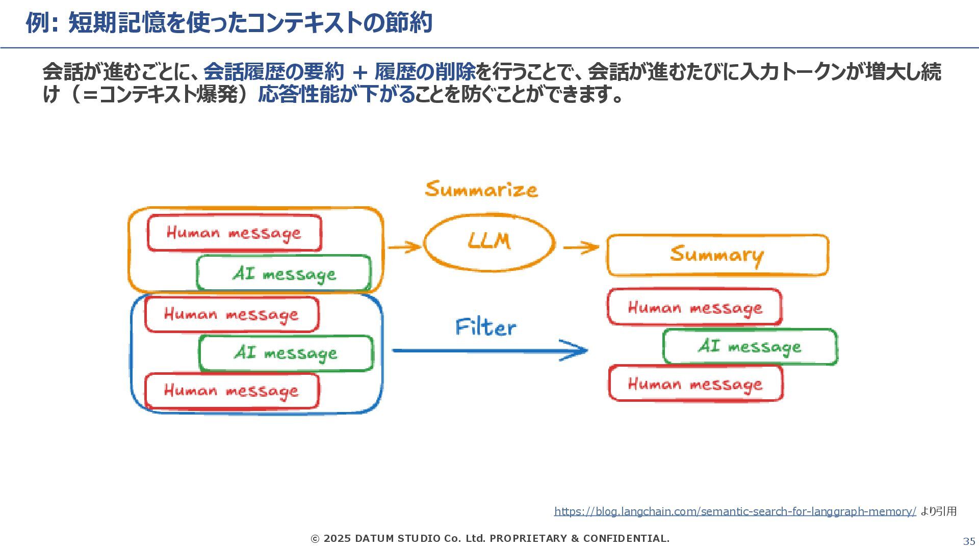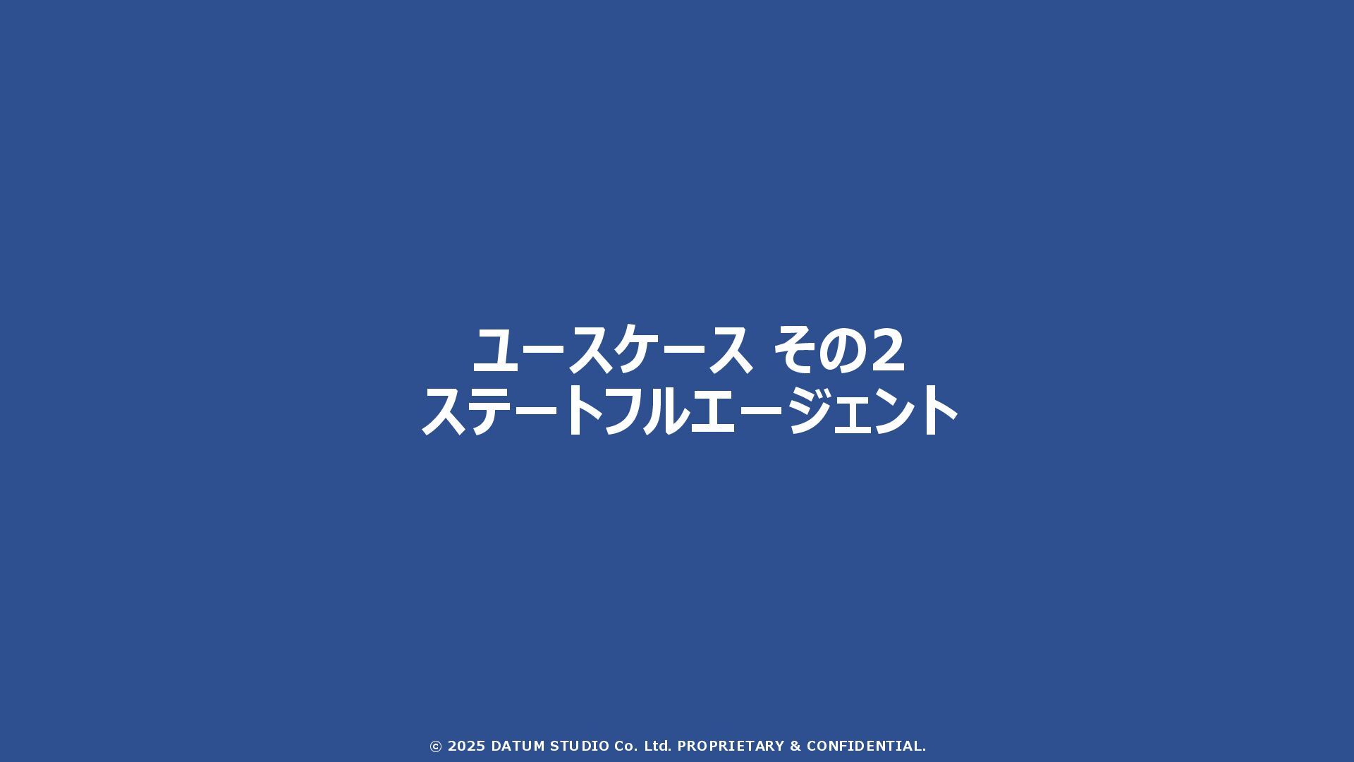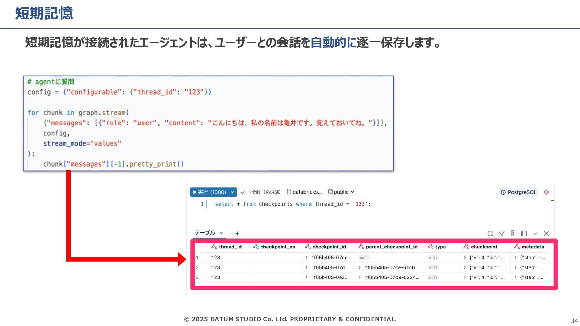長期記憶 store = PostgresStore( connection_string="postgresql://user:pass@localhost:5432/dbname", index={ "dims": 1536, "embed": init_embeddings("openai:text-embedding-3-small"), "fields": ["text"], }, ) store.setup() store.put(("docs",), "doc1", {"text": "Python tutorial"}) results = store.search( ("user_123", "interactions"), query=state["messages"][-1].content, filter={"type": "conversation"}, limit=3 ) 長期記憶が接続されたエージェントは、セッションを跨いで記憶を共有することが可能です。pgvector による セマンティック検索も可能です。 長期記憶のセットアップ (埋め込みモデルを指 定) データ挿入 長期記憶へのクエリ (pgvector によるセマ ンティック検索) https://blog.langchain.com/semantic-search-for-langgraph-memory/ より転載