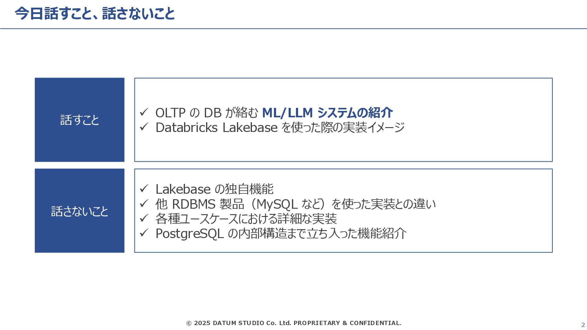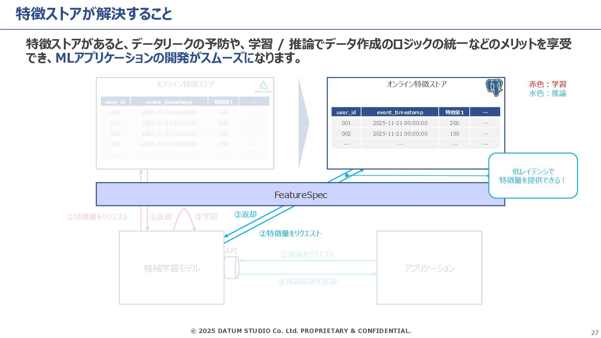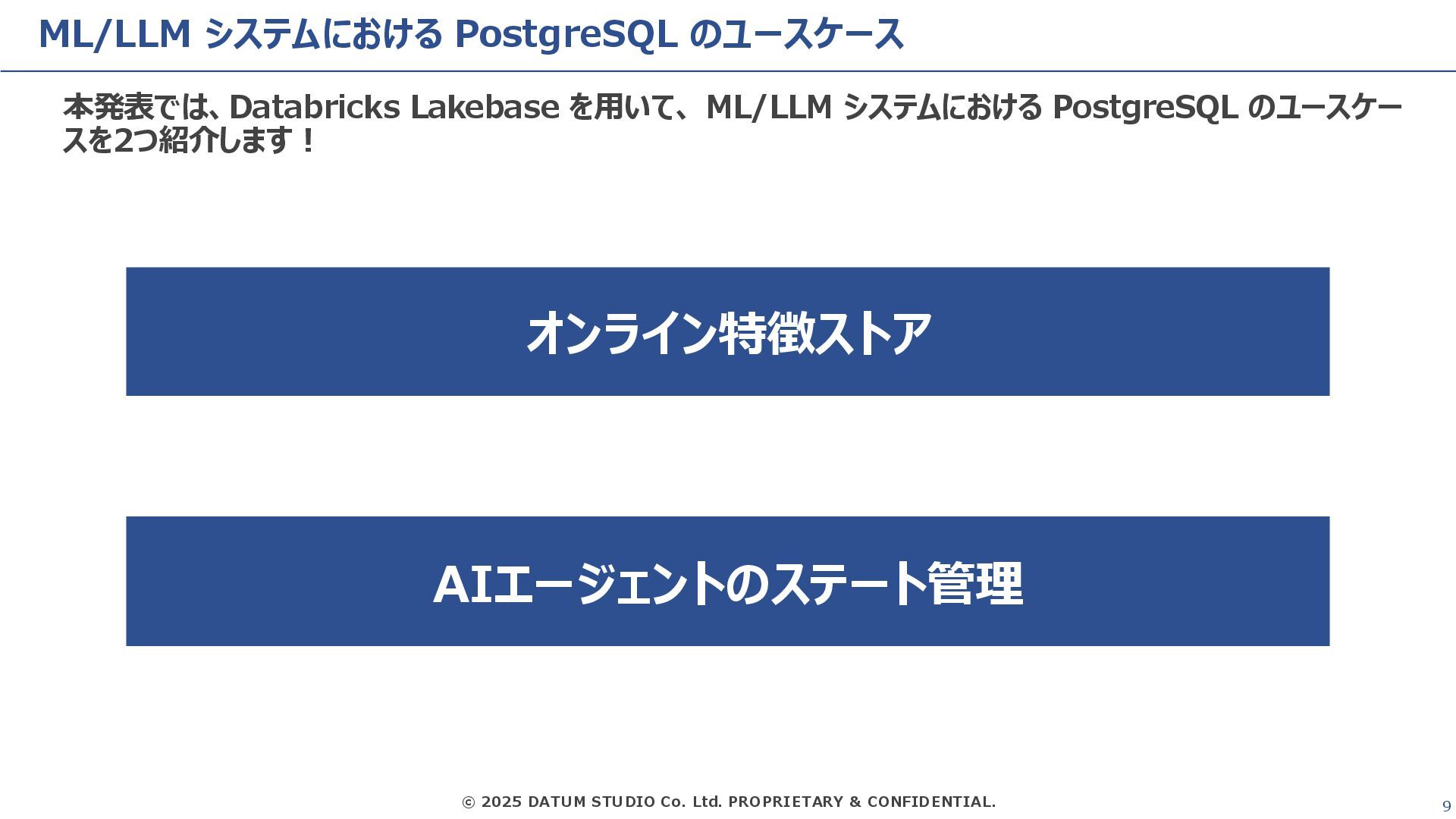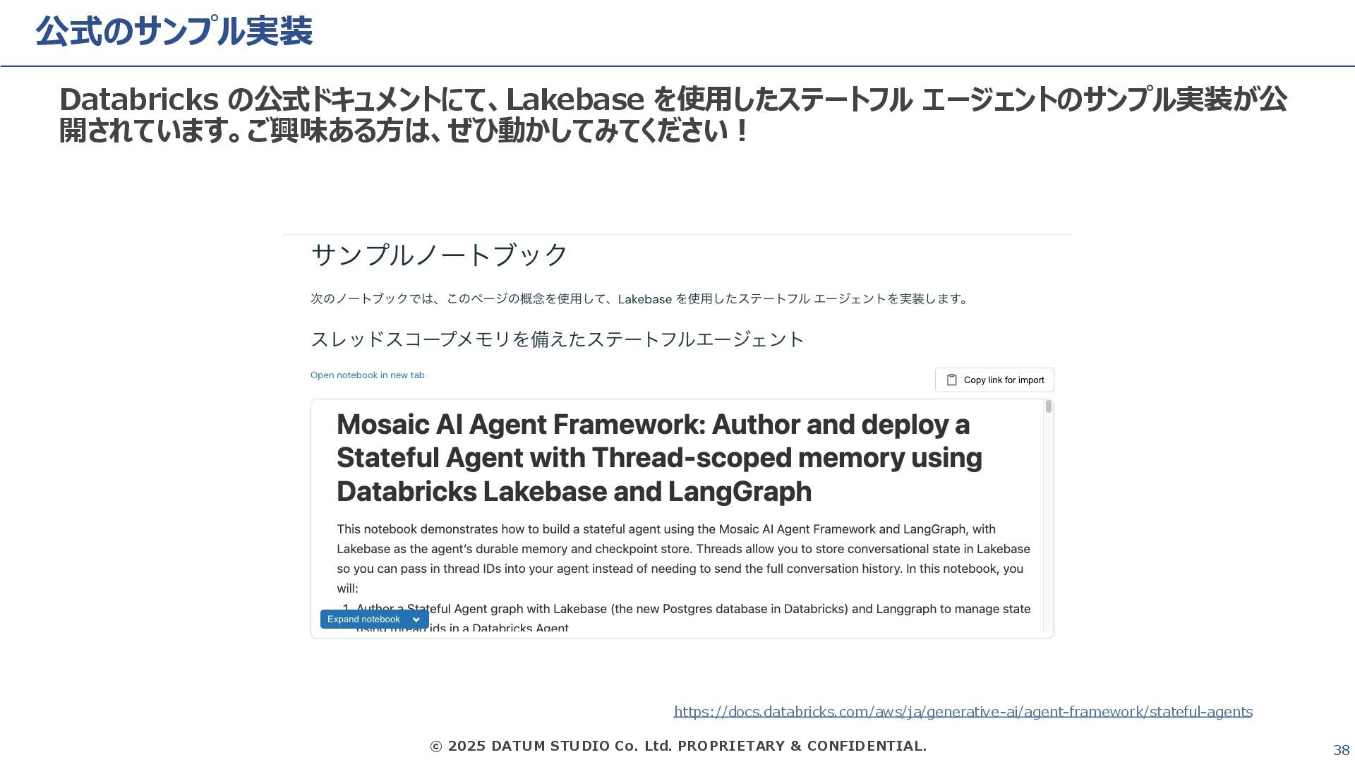 長期記憶 store = PostgresStore( connection_string="postgresql://user:pass@localhost:5432/dbname", index={ "dims": 1536, "embed": init_embeddings("openai:text-embedding-3-small"), "fields": ["text"], }, ) store.setup() store.put(("docs",), "doc1", {"text": "Python tutorial"}) results = store.search( ("user_123", "interactions"), query=state["messages"][-1].content, filter={"type": "conversation"}, limit=3 ) 長期記憶が接続されたエージェントは、セッションを跨いで記憶を共有することが可能です。pgvector による セマンティック検索も可能です。 長期記憶のセットアップ (埋め込みモデルを指 定) データ挿入 長期記憶へのクエリ (pgvector によるセマ ンティック検索) https://blog.langchain.com/semantic-search-for-langgraph-memory/ より転載