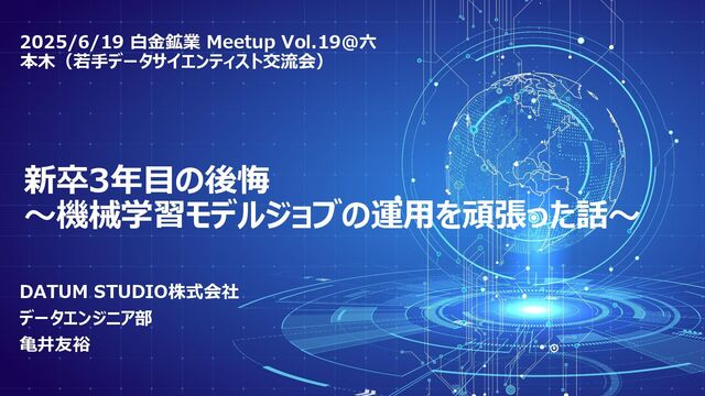 新卒3年目の後悔 〜機械学習モデルジョブの運用を頑張った話〜 DATUM STUDIO株式会社 データエンジニア部 亀井友裕 2025/6/19 白金鉱業 Meetup Vol.19@六
