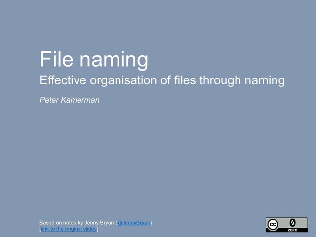 expression and globbing friendly (avoid white space, punctuation, accented characters; stick to one letter case) WRONG: Bjørn’s Awesome Slides.pptx BETTER: bjorns-awesome-slides.pptx • Easy to compute on (deliberate use of delimiters to separate meta-data units) WRONG: file 1 bjorns awesome slides 2020/10/10.pptx BETTER: file-01_bjorns-awesome-slides_2020-10-10.pptx In this use case: Underscores “_” were used to delimit units of meta-data; Hyphens “-” were used to separate words/numbers within each meta-data unit