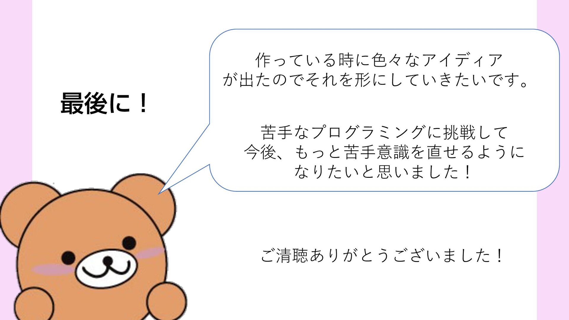 ࠷ޙʹʂ ご清聴ありがとうございました! 作っている時に⾊々なアイディア が出たのでそれを形にしていきたいです。 苦⼿なプログラミングに挑戦して 今後、もっと苦⼿意識を直せるように なりたいと思いました!