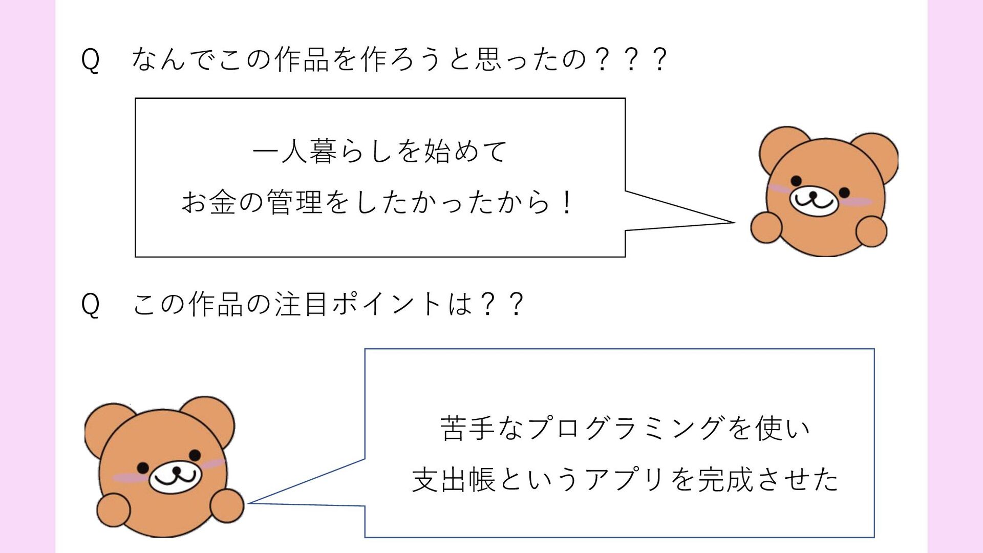 Q なんでこの作品を作ろうと思ったの??? ⼀⼈暮らしを始めて お⾦の管理をしたかったから! Q この作品の注⽬ポイントは?? 苦⼿なプログラミングを使い ⽀出帳というアプリを完成させた