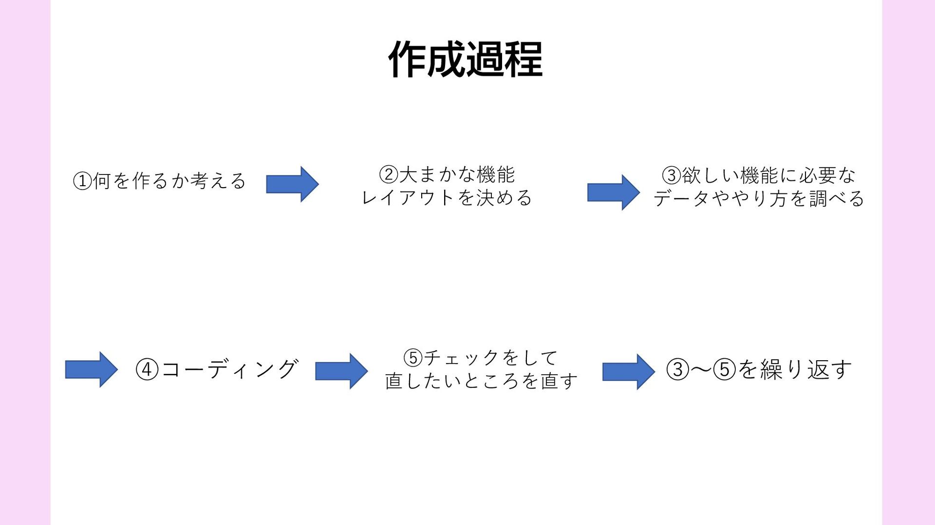 ࡞աఔ ①何を作るか考える ②⼤まかな機能 レイアウトを決める ③欲しい機能に必要な データややり⽅を調べる ④コーディング ⑤チェックをして 直したいところを直す ③〜⑤を繰り返す