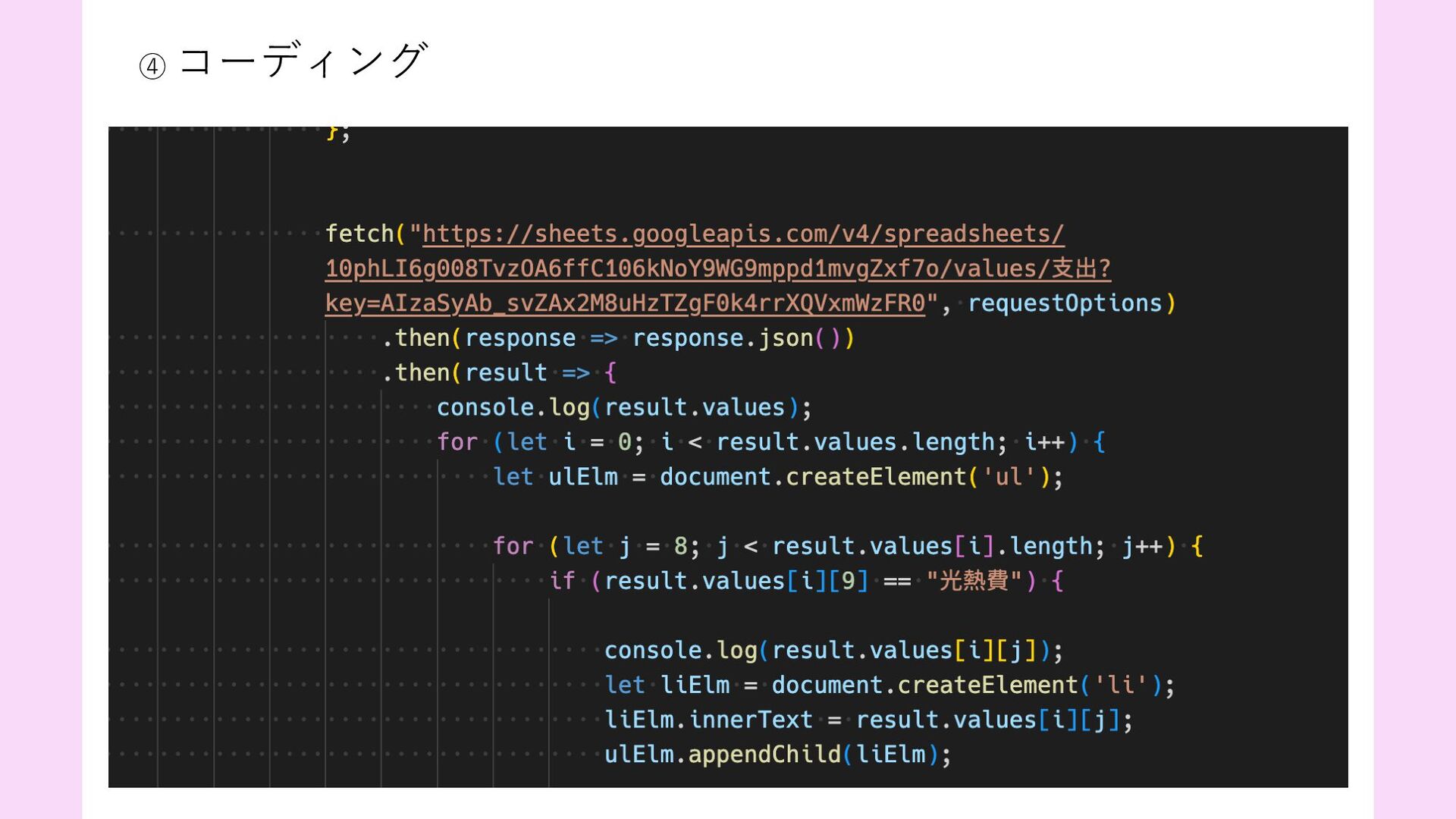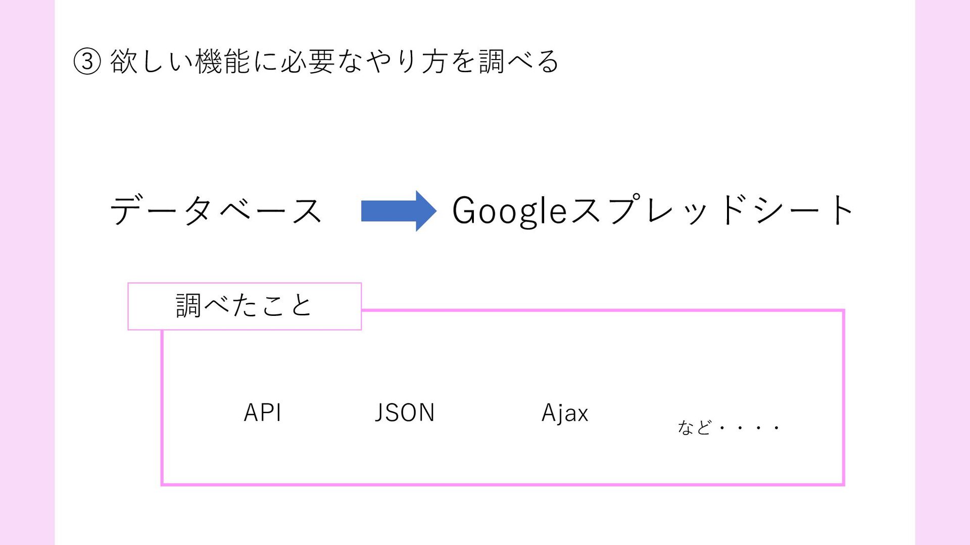 データベース Googleスプレッドシート API JSON Ajax など・・・・ ③ 欲しい機能に必要なやり⽅を調べる 調べたこと