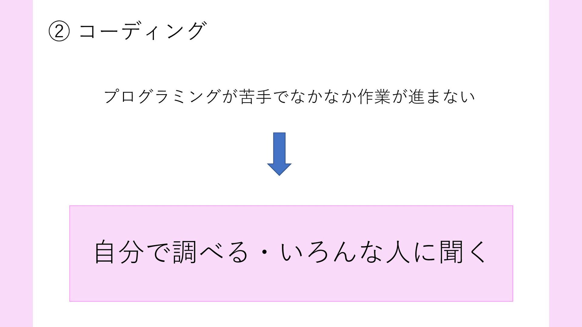 ② コーディング プログラミングが苦⼿でなかなか作業が進まない ⾃分で調べる・いろんな⼈に聞く