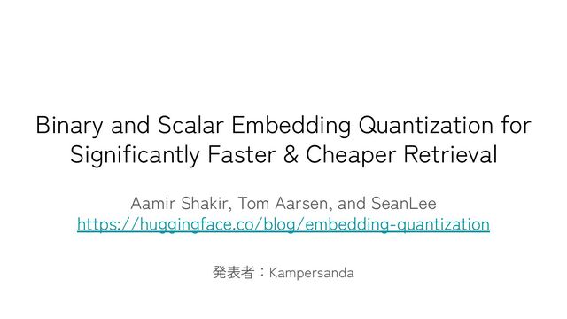 Retrieval Aamir Shakir, Tom Aarsen, and SeanLee https://huggingface.co/blog/embedding-quantization 発表者:Kampersanda