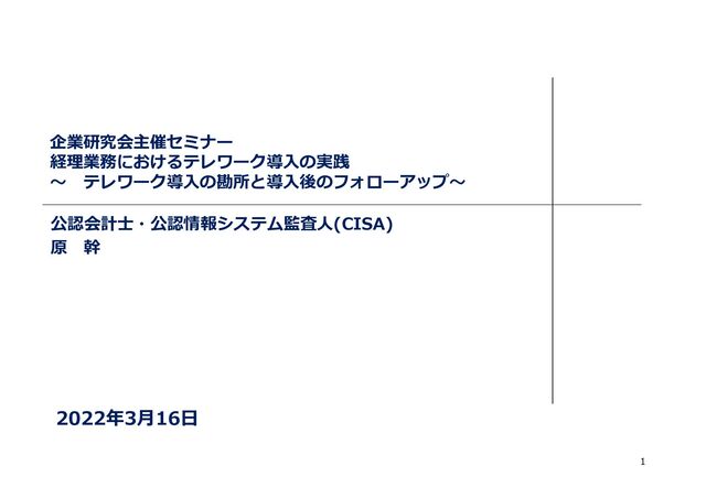 「働き方改革」の推進が各企業で積極的に取り組まれるようになり、それに呼応するようにテレワーク(リモートワーク)への取り組みが増加している。ワークライフバランスを確立し、さまざまな勤務スタイルに対応するうえで、従前にない柔軟な就労形態を企業が整備する要請が高まっている。また新型コロナウイルスへの対応の要請という緊急状況を受けてテレワークも多くの企業で導入されつつある。経理業務においてもテレワーク導入の流れは加速しており、企業はこれまでと異なる常識での業務プロセスを運用しなければならない。一方で、テレワークは統制リスクやセキュリティリスクを強く意識して運用することが避けられない。特に経理業務は重要データを日常的に扱うことから、特に慎重な対応をとるべきと考えられる。業務上利用する重要データを取り扱ううえでどのような配慮が必要なのかといった点についてテレワーク導入のノウハウが蓄積されるとともに、導入済みの企業においてもさまざまな課題が出てきた。本セミナーでは、特に経理業務におけるテレワークの導入やその後の状況につき、新型コロナウイルス対応を踏まえた現在の状況を概観し、今後の展望を概説する。