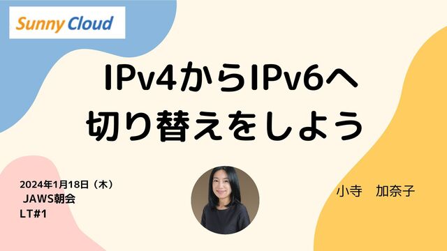 小寺 加奈子 2024年1月18日(木) JAWS朝会 LT#1 IPv4からIPv6へ 切り替えをしよう