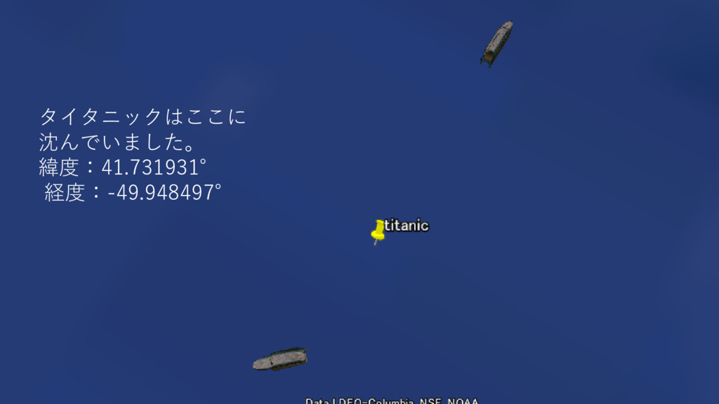 タイタニックはここに 沈んでいました。 緯度:41.731931° 経度:-49.948497°
